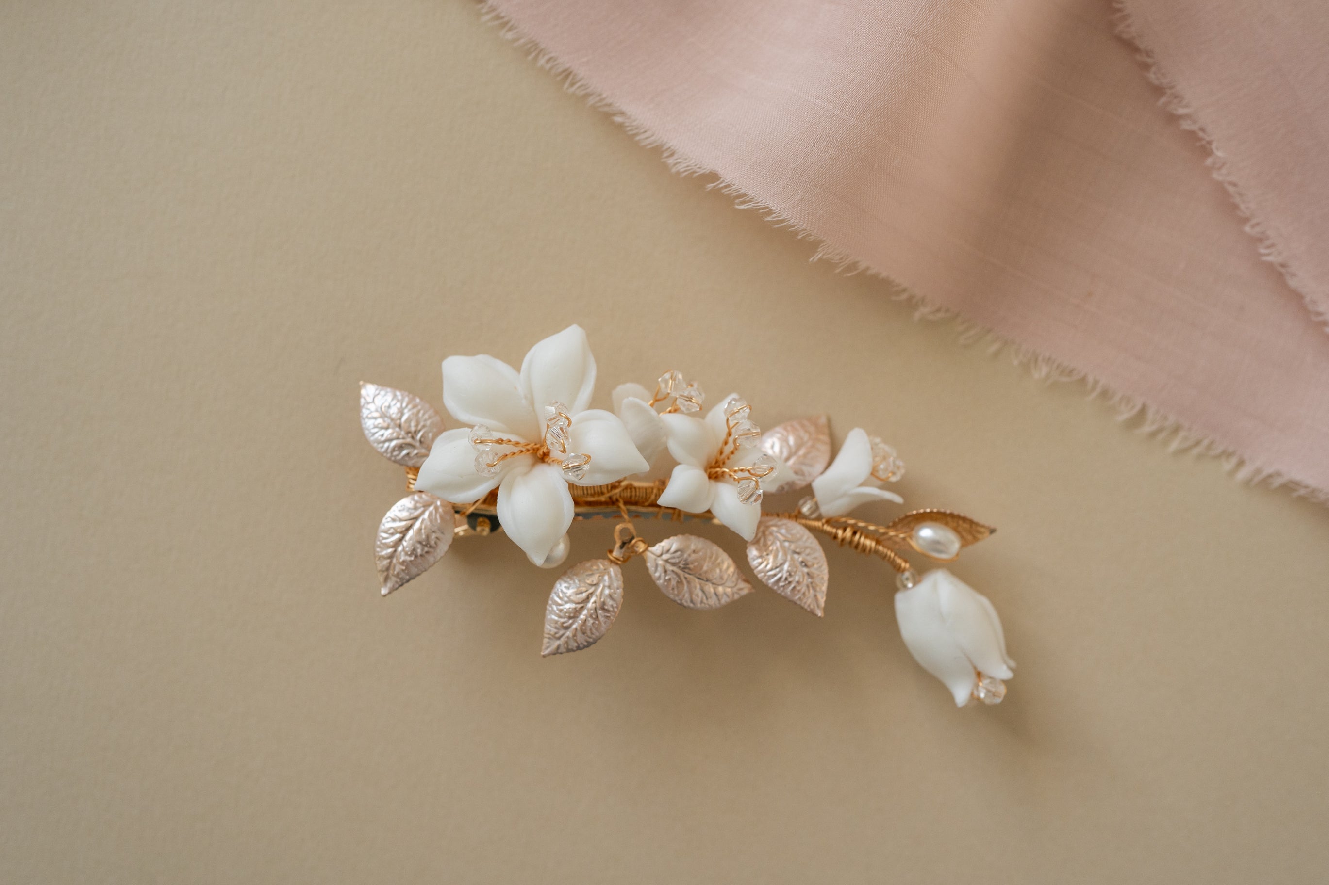 It took me awhile to decide on a comb and let me say I am so glad to have picked the Etta! It is stunning and the porcelin flowers are lovely. This piece is filled with details and is absolutely beautiful. Big shout out to the duo of Brides and Belts, easy to communicate with and are very tentive and quick to respond and help. Shipping was fast and it came perfectly packaged. I can't say this enough but thank you Brides and Belts, I absolutely love the Etta and I can't wait to wear this on my Wedding Day.