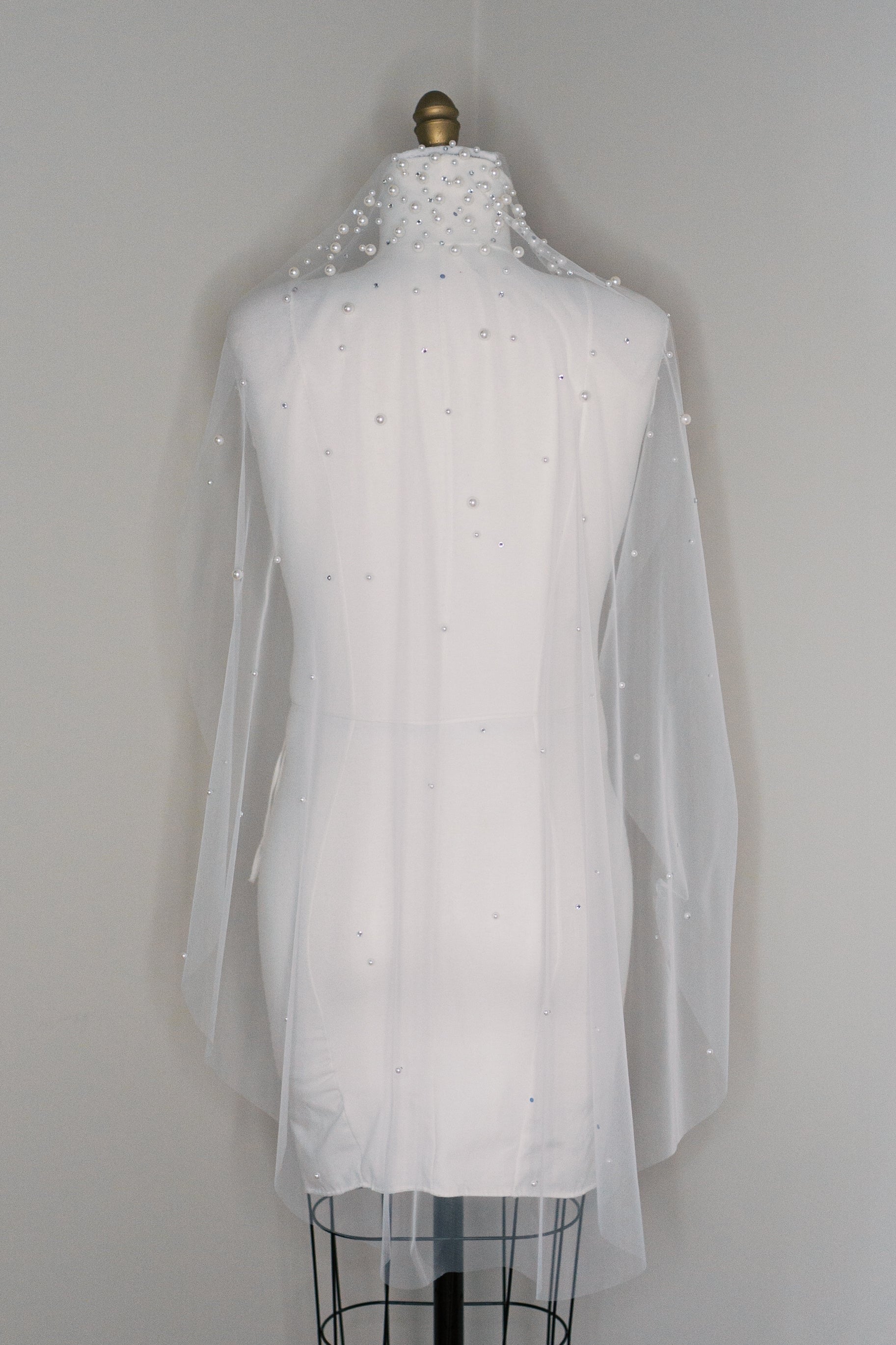 It has a stunning cascading pearl and rhinestone design with a clean edge.
