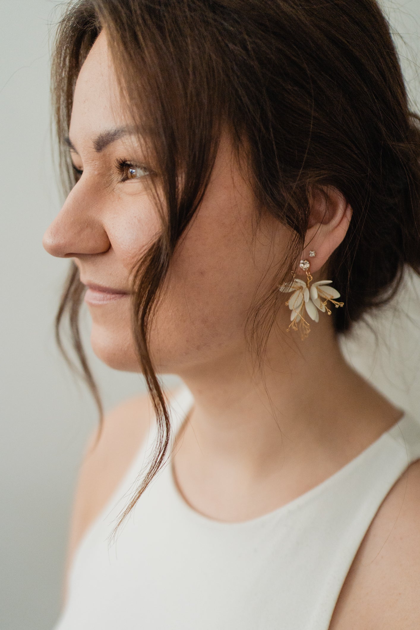 These gorgeous handmade earrings are made from beads and enamel flowers. They have a beautiful flower shape and have a gold wire design. Wear them for your wedding day, a bridal shower or bachelorette party!