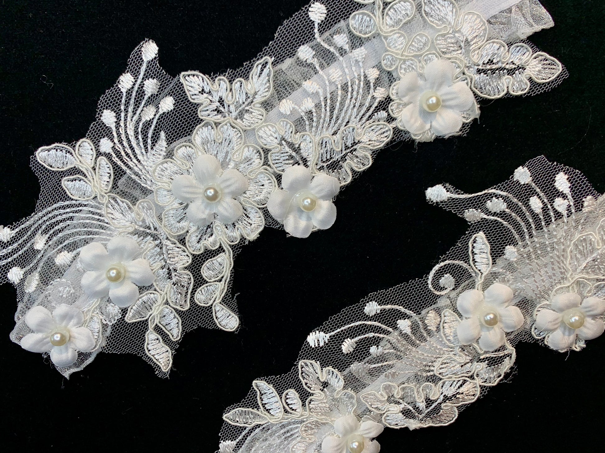 This beautiful garter is made up of a white organza fabric and lace. Lace flowers are accented with pearls.