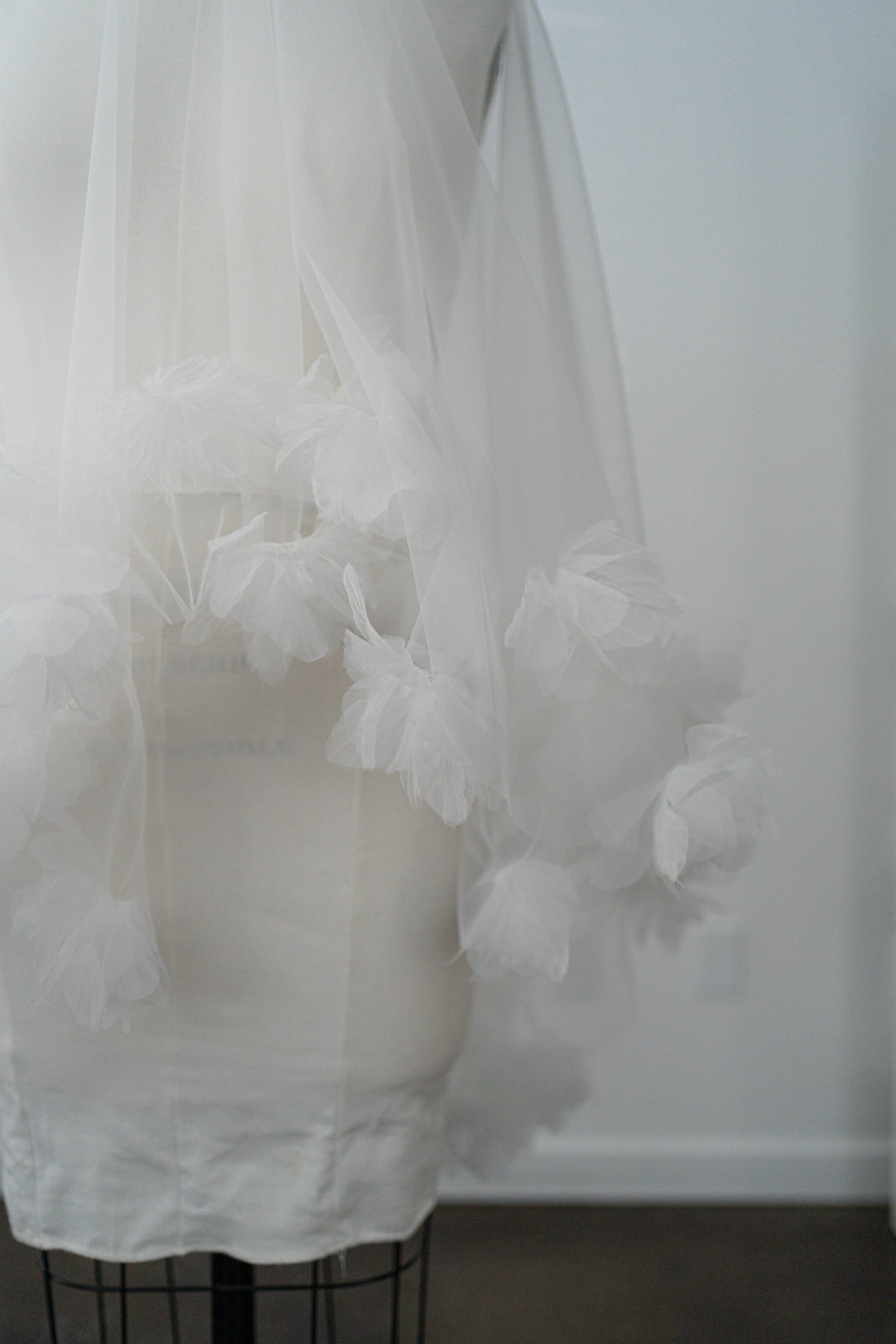 With a stunning organza flower design, this veil will surely be the talk of your wedding ensemble! It's a drop veil with a comb and features a hi-low design.
