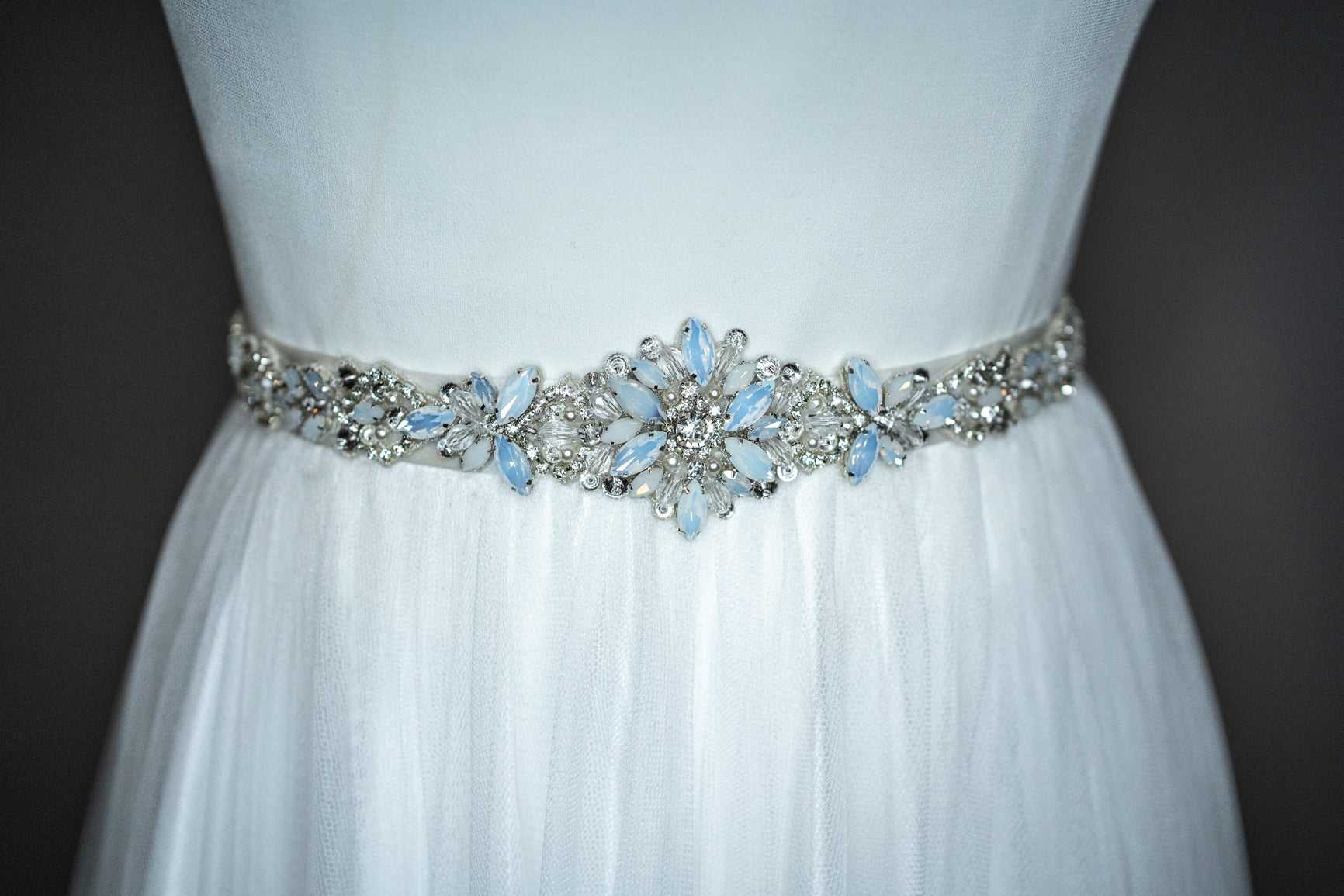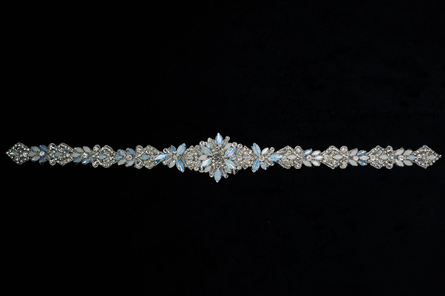 This gorgeous handmade crystal, rhinestone silver opal applique is stunning! The opal stones are the perfect "something blue" for your wedding day!