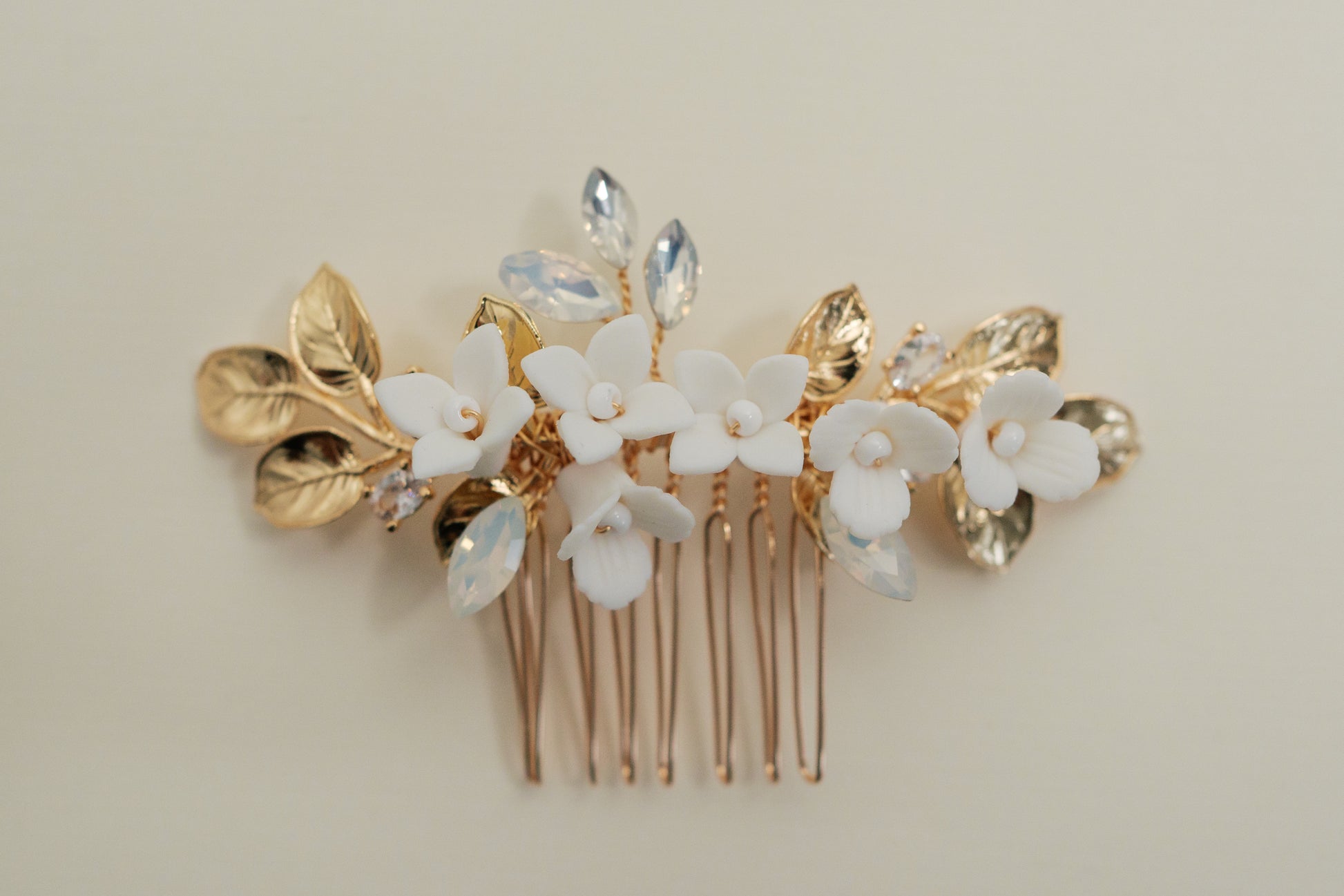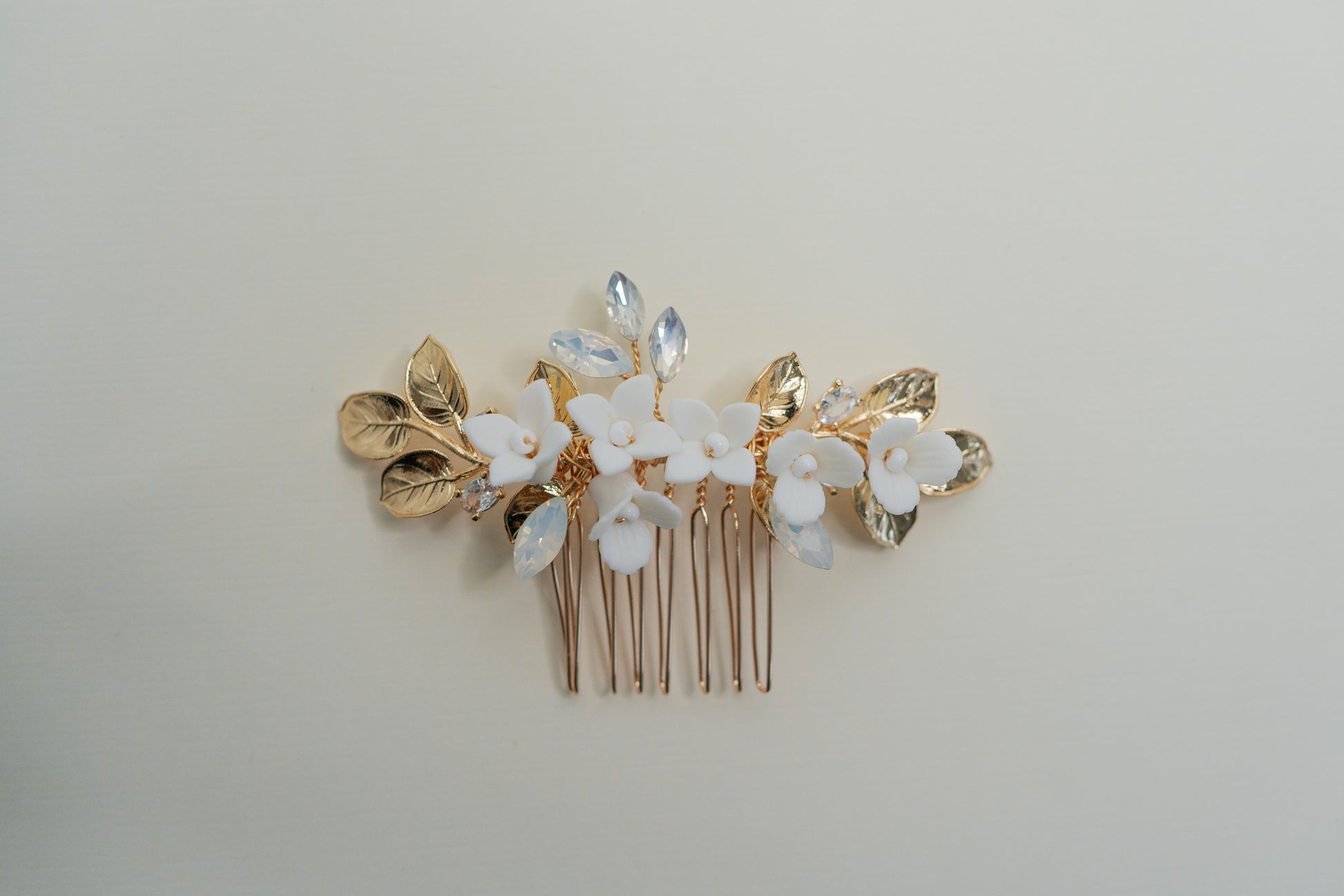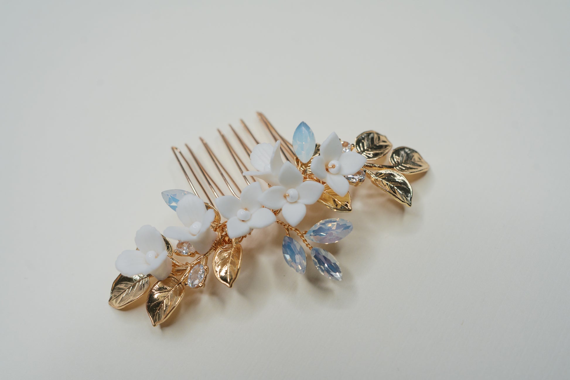 Adorned with porcelain flowers, opal rhinestones and gold leaves, this hair comb is simple yet stunning.