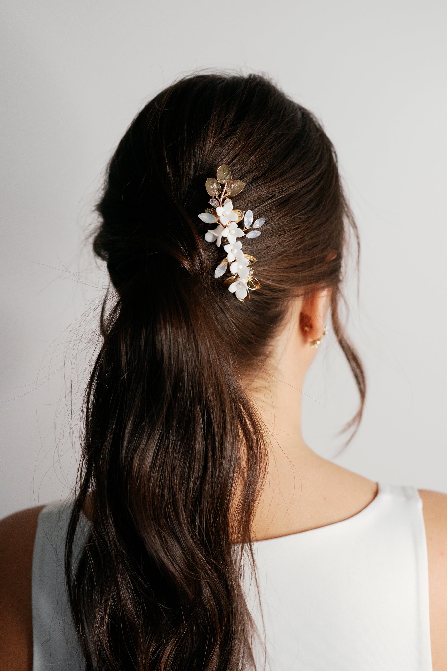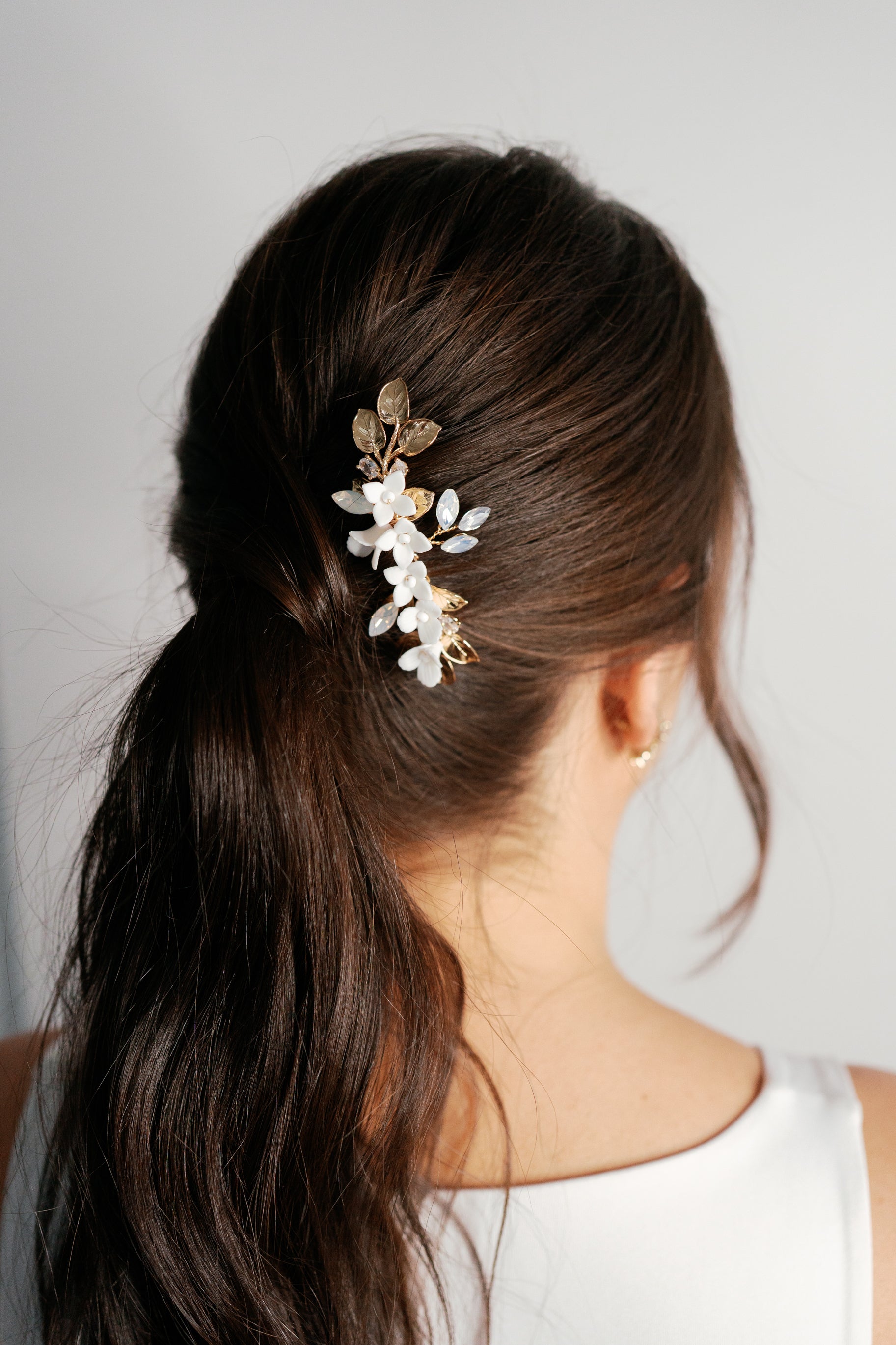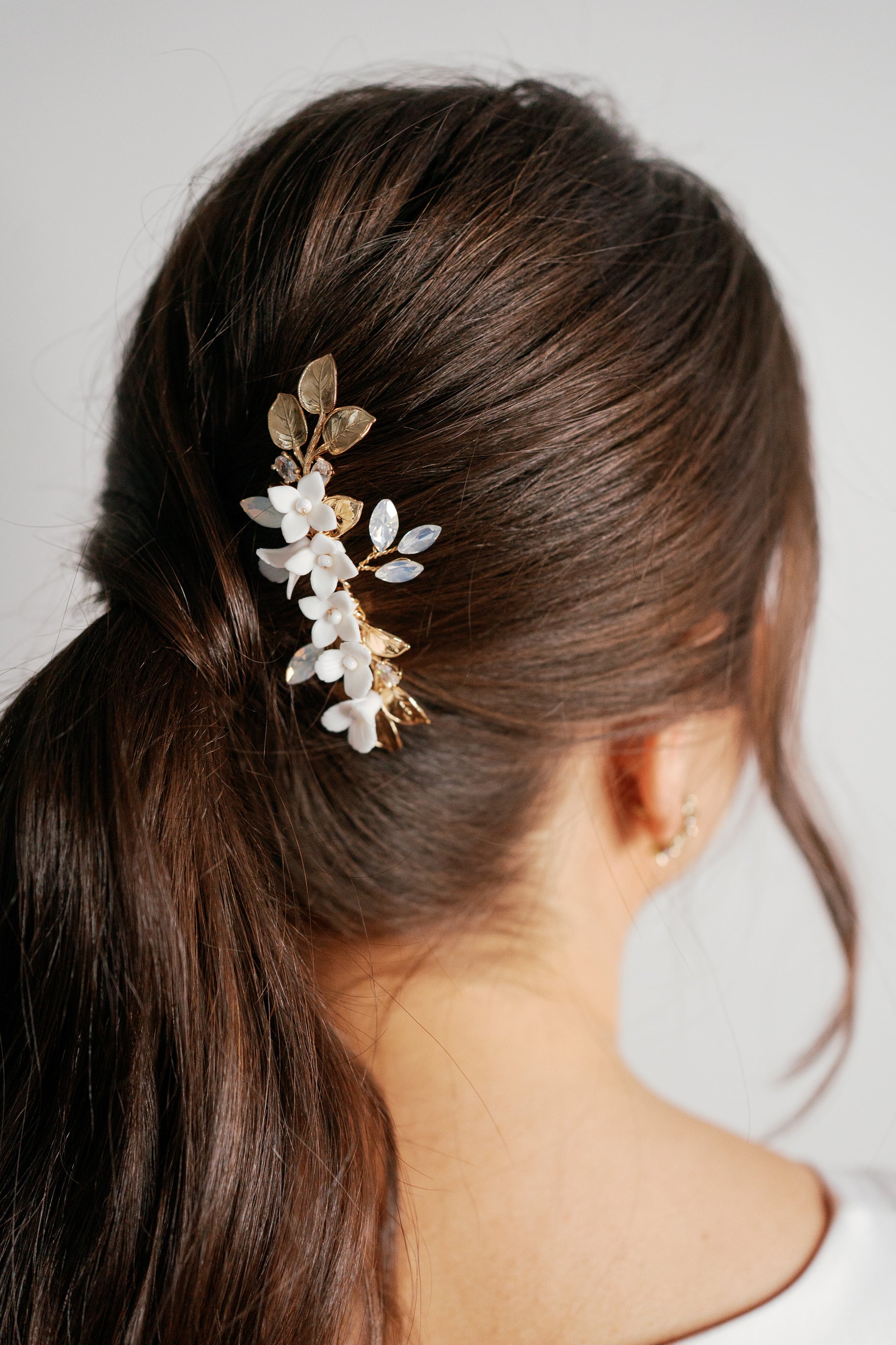 Adorned with porcelain flowers, opal rhinestones and gold leaves, this hair comb is simple yet stunning.