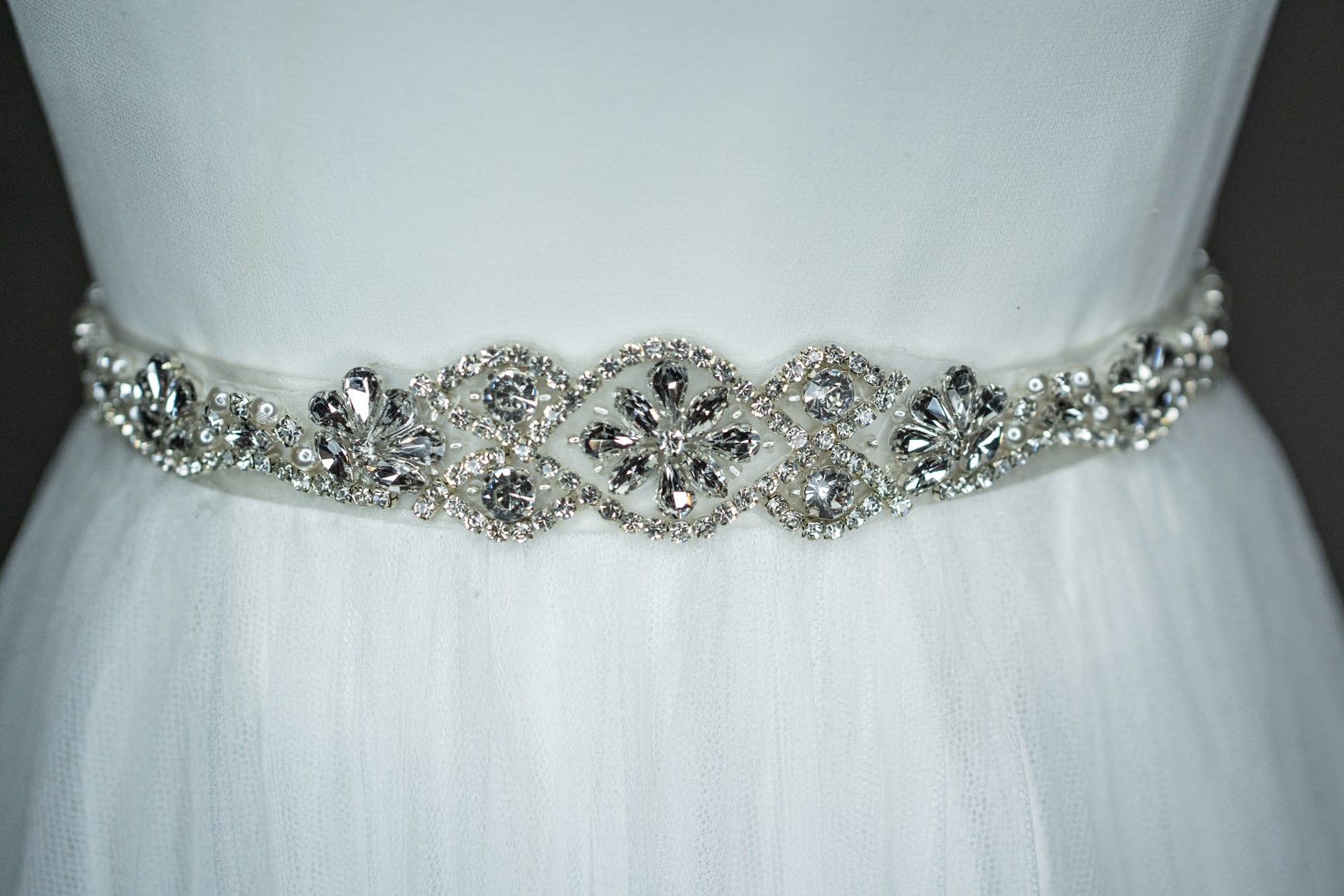 We love this stunning handmade rhinestone, pearl and crystal belt! This belt comes in both silver and rose gold and is the perfect addition to your wedding dress!