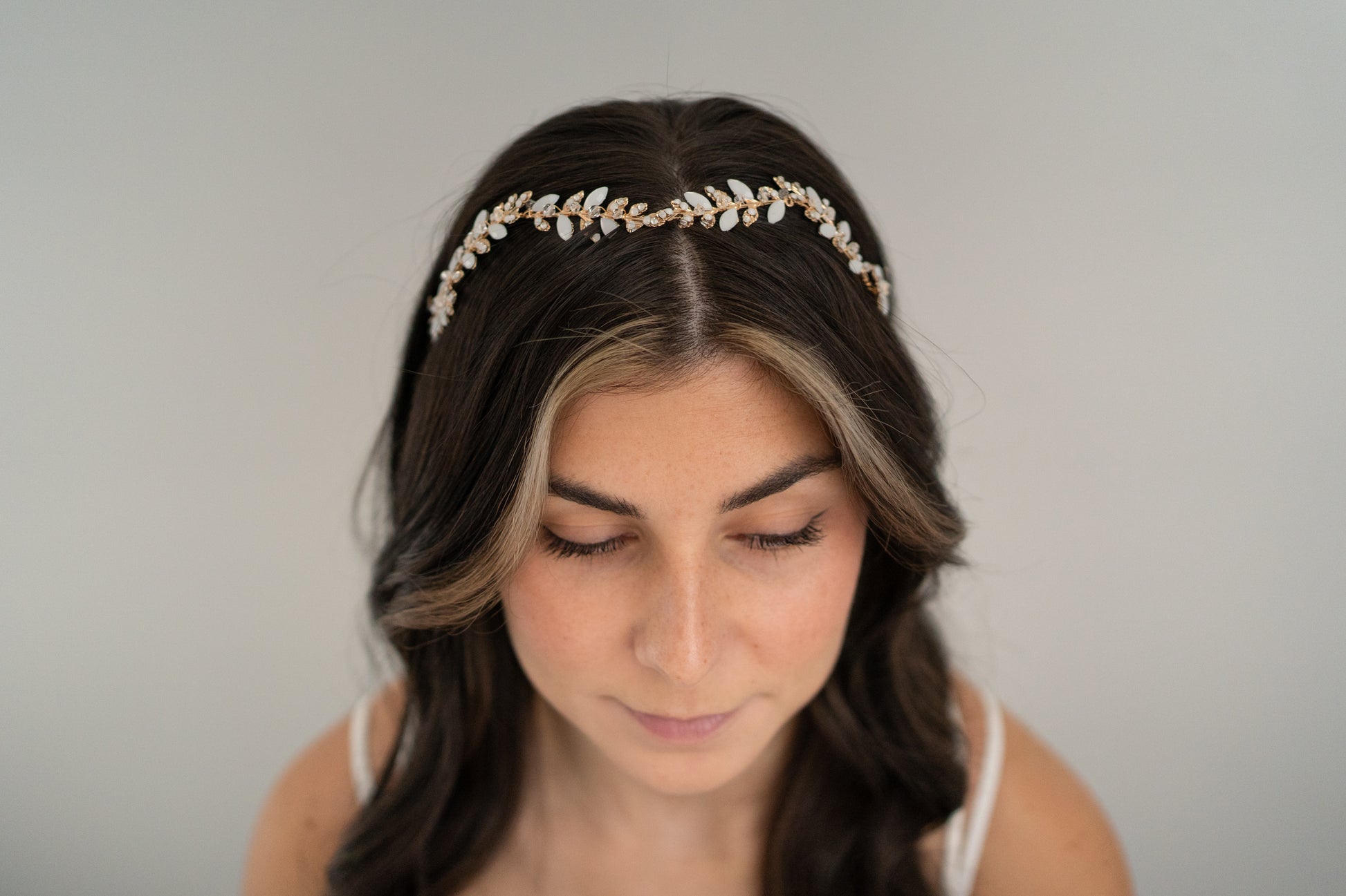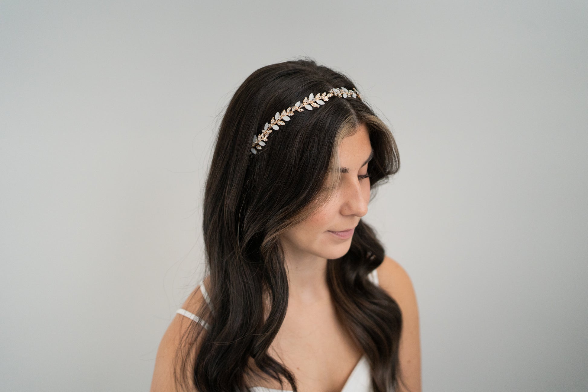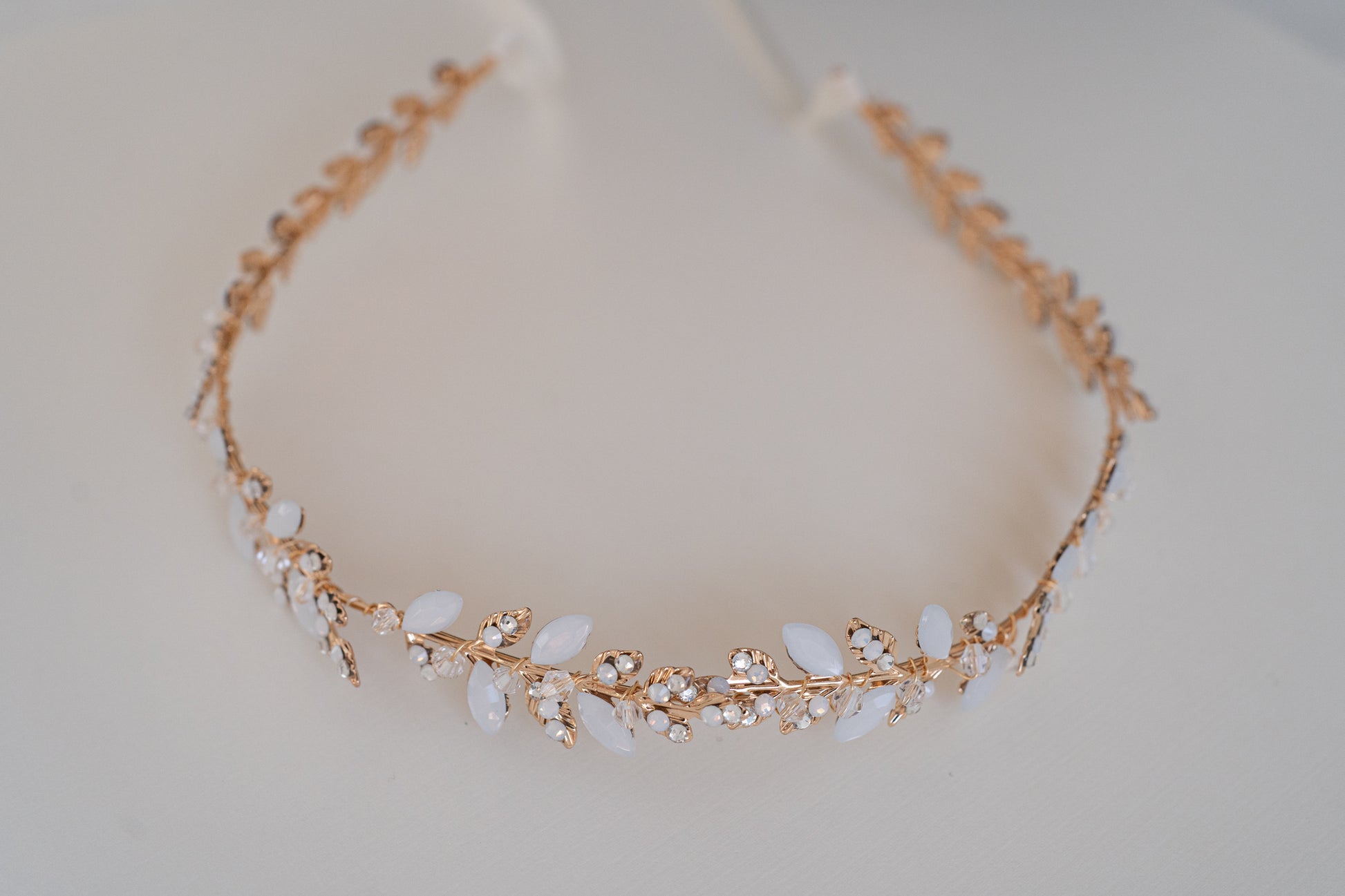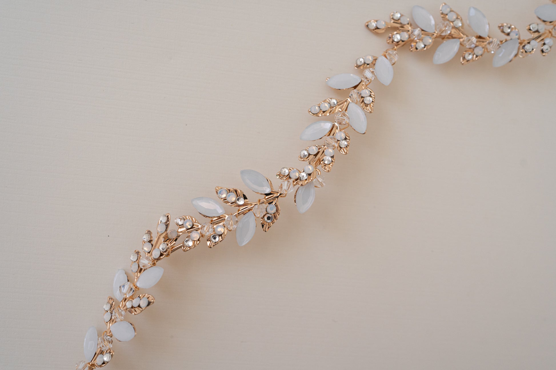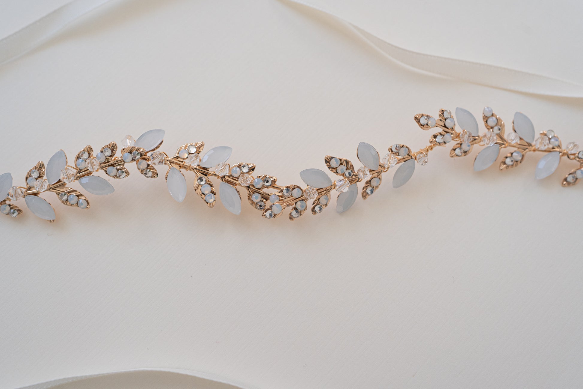 Enhance your bridal look with The Brooklyn. Featuring brass gold leaves and shimmering opal stones, this accessory can be styled as a headband or hair vine.