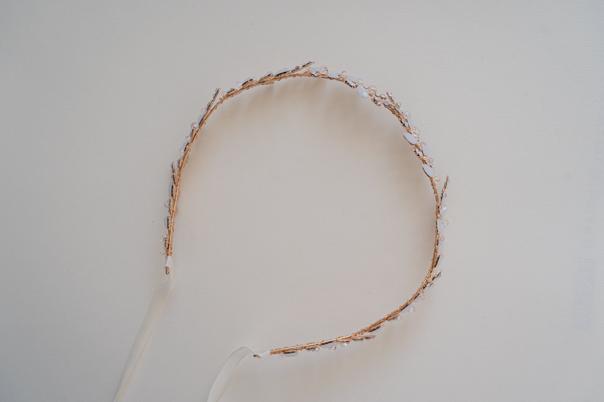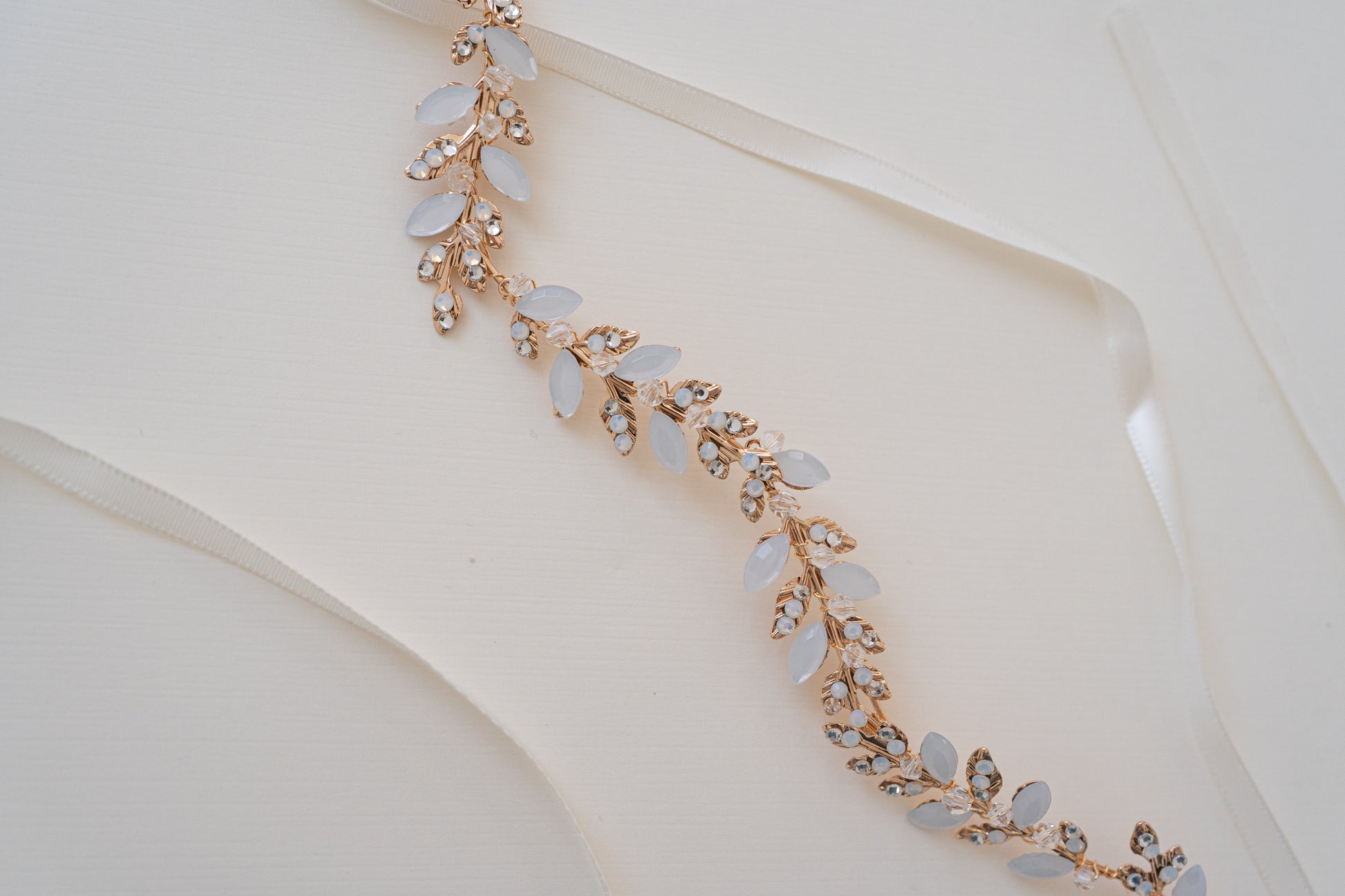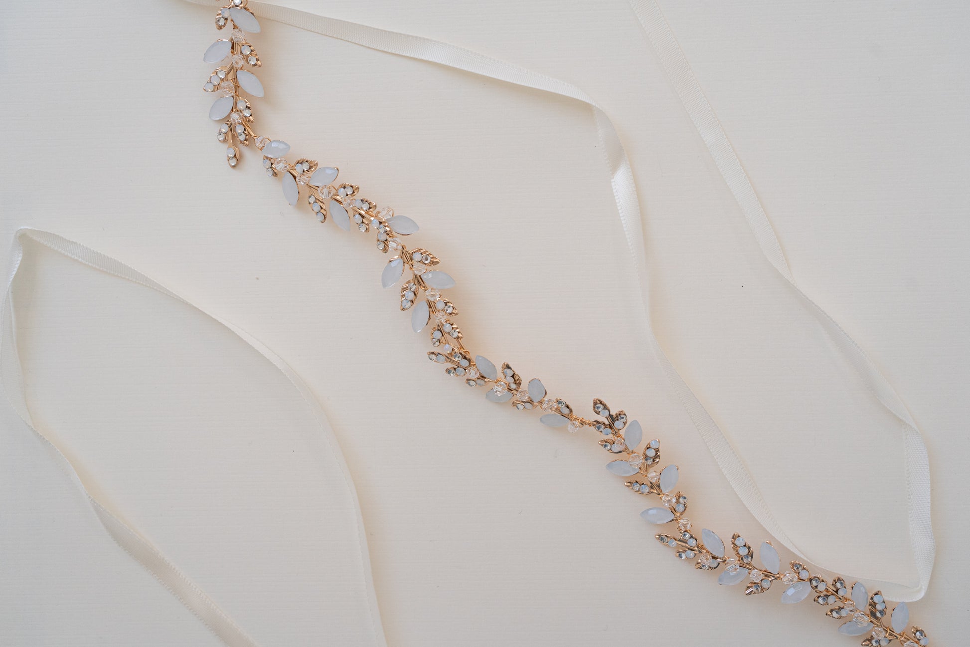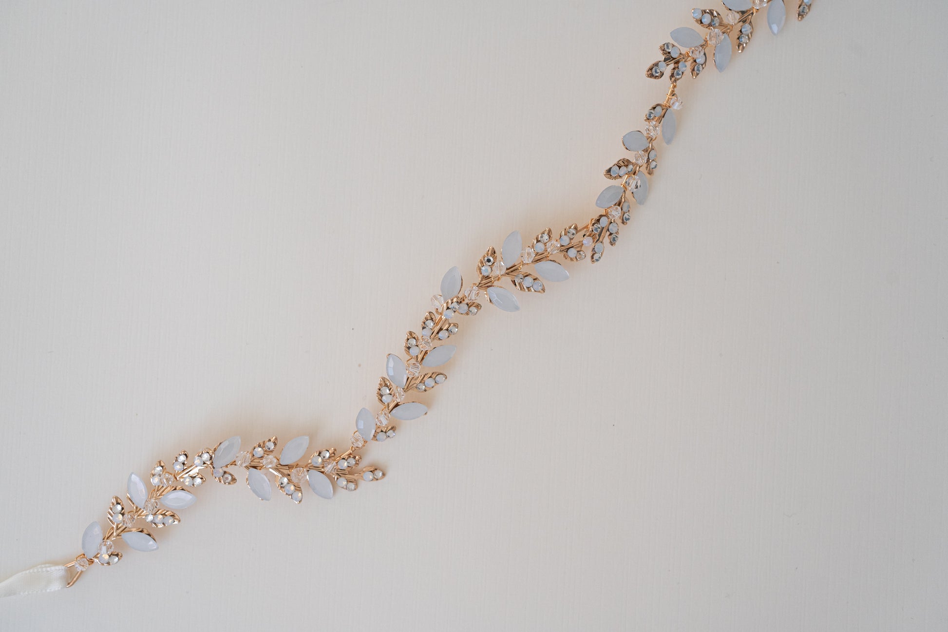 Included with the accessory is an off-white satin ribbon for easy customization. Simply tie it around your head for a headband look, or weave it through braids or wrap it around a bun for a hair vine style.