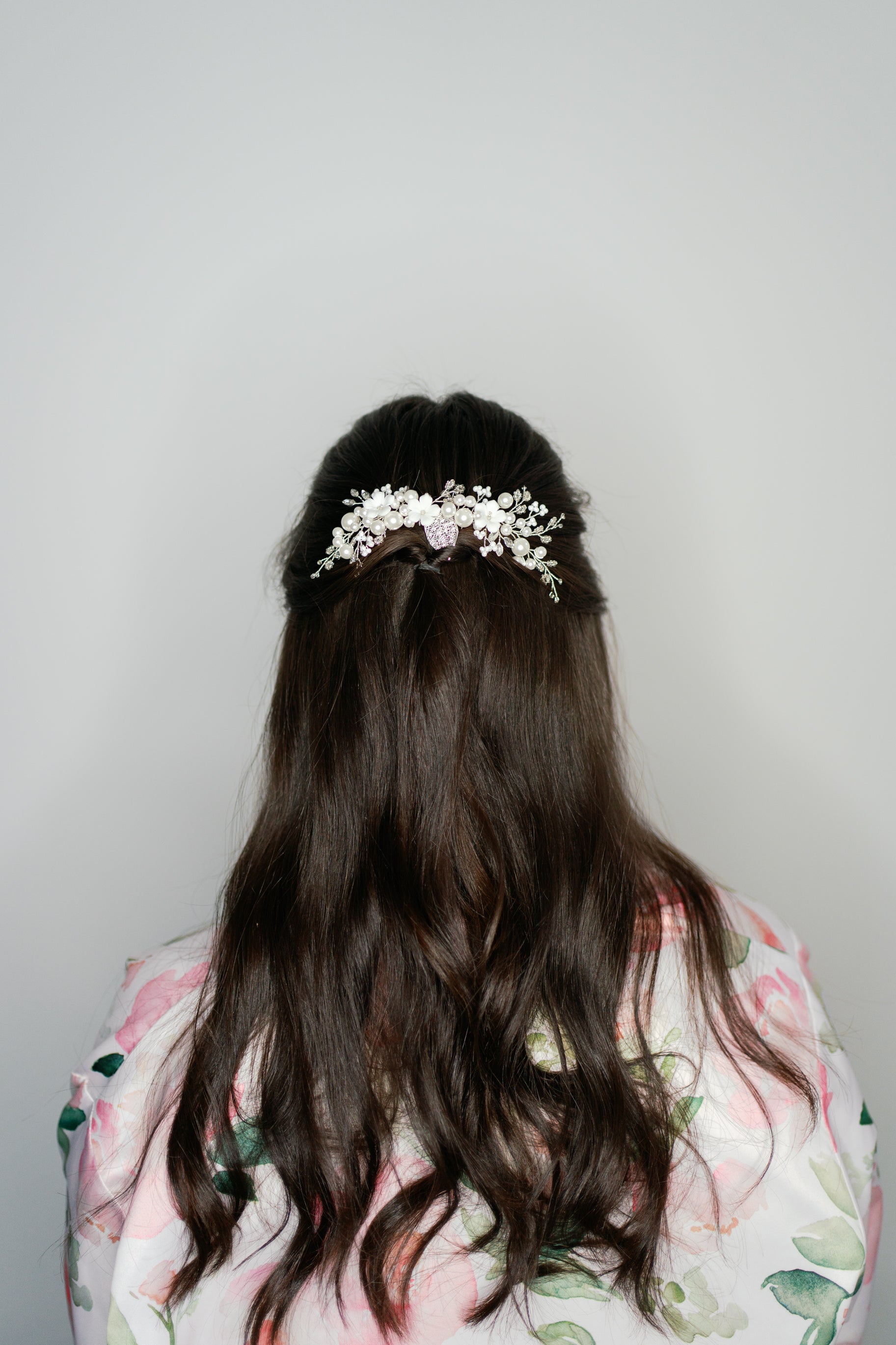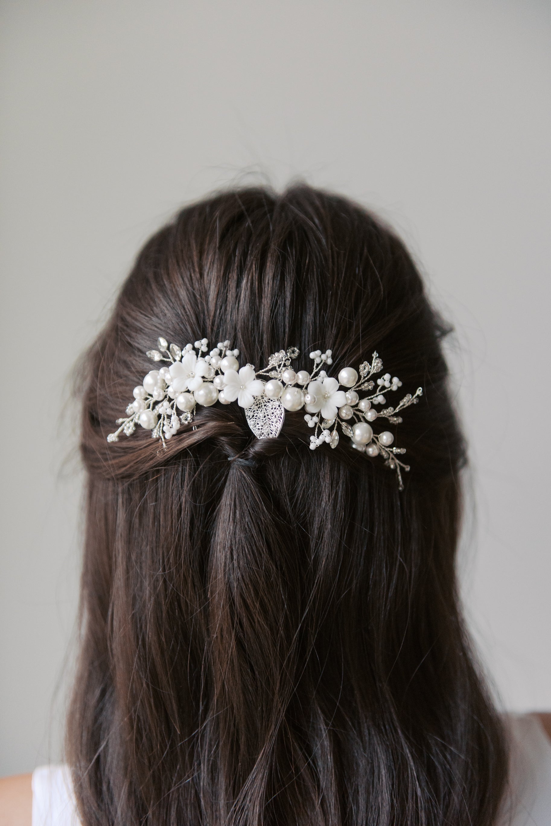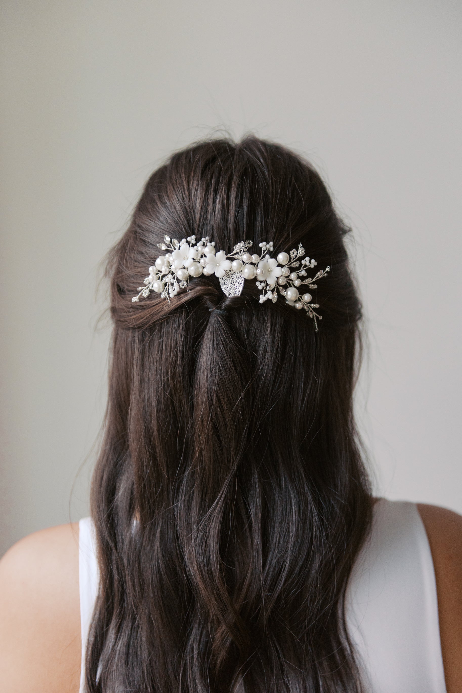Adorned with porcelain flowers, pearls, and delicate beads, this hair comb is the perfect finishing touch to complete your bridal look.