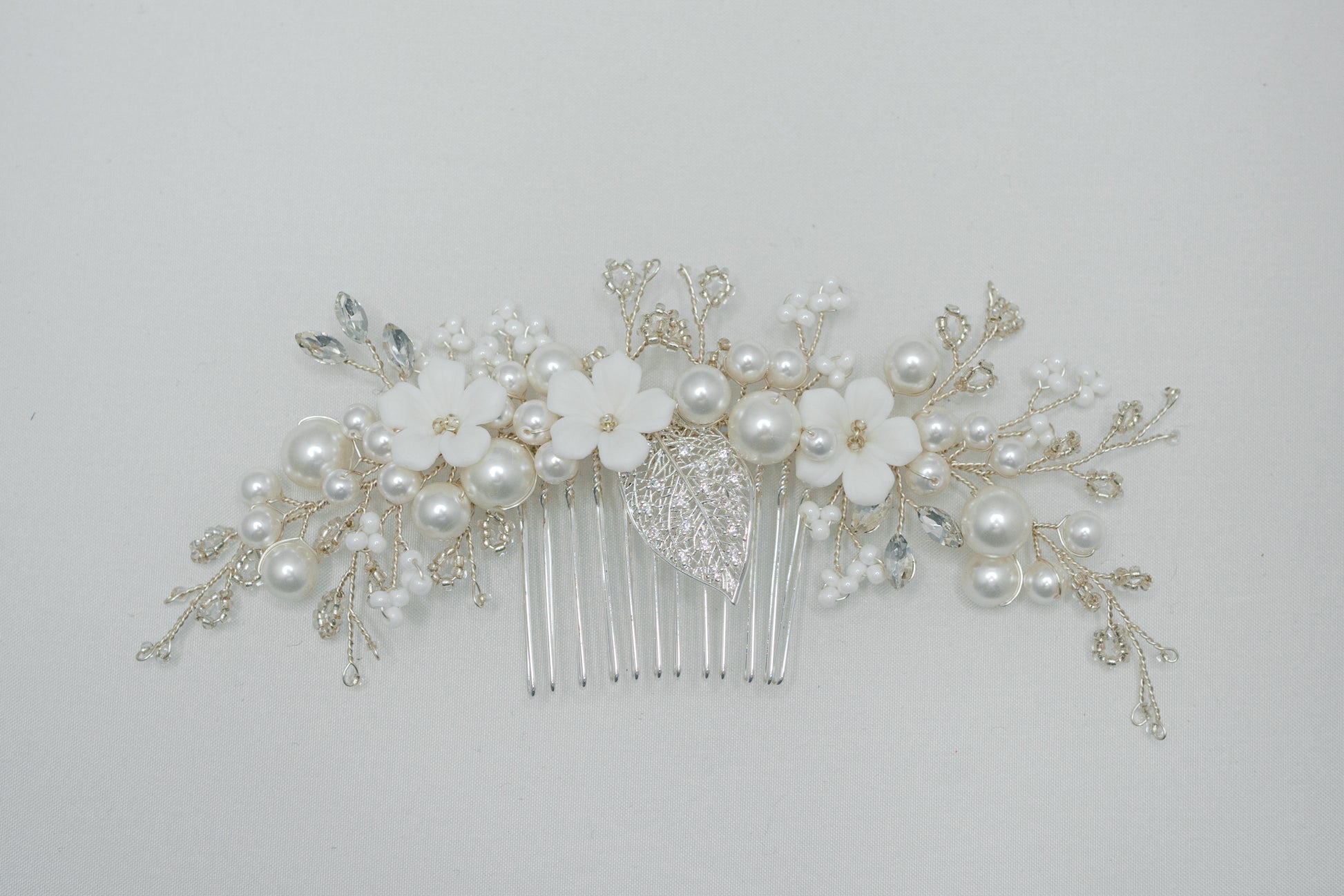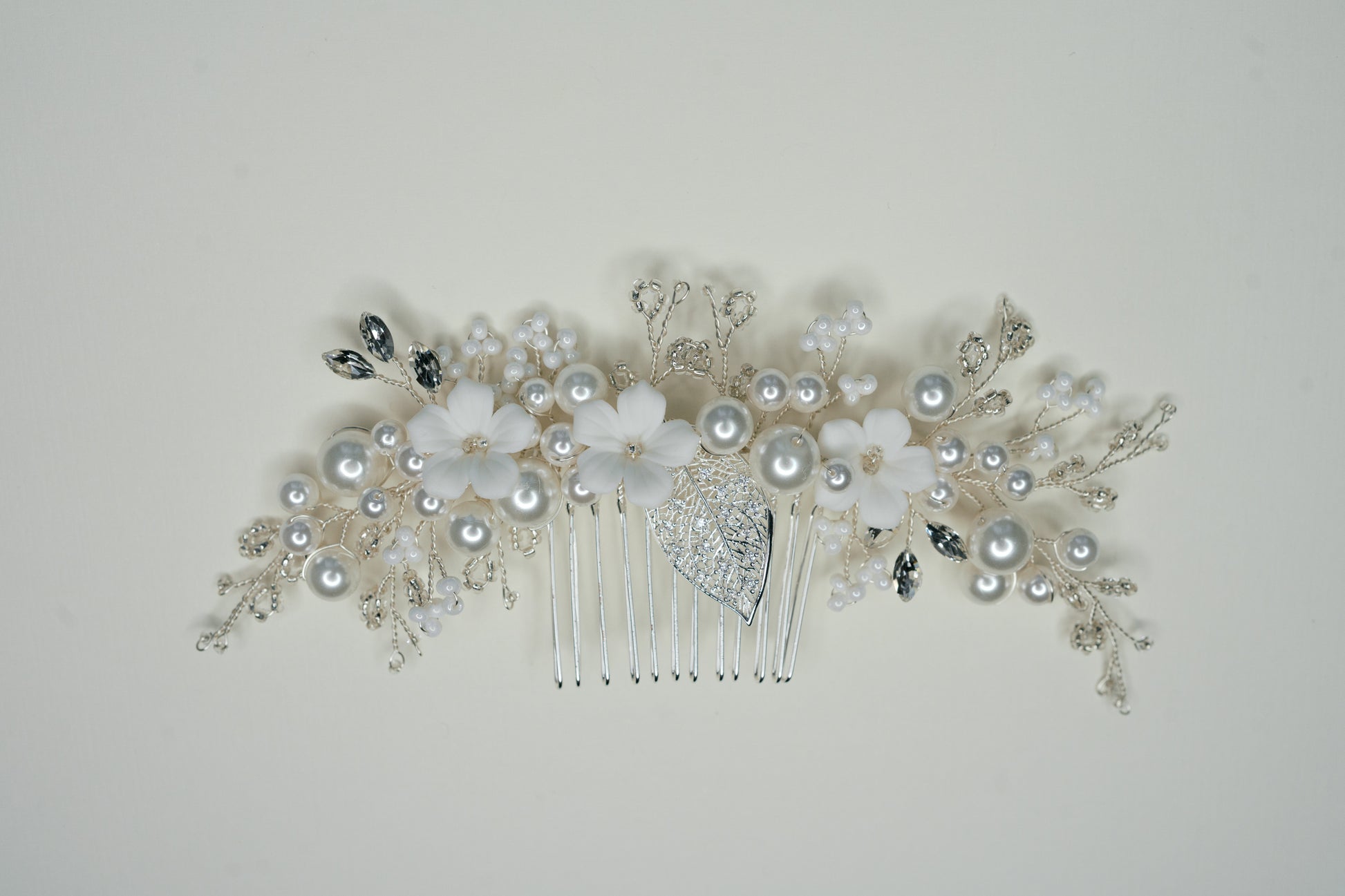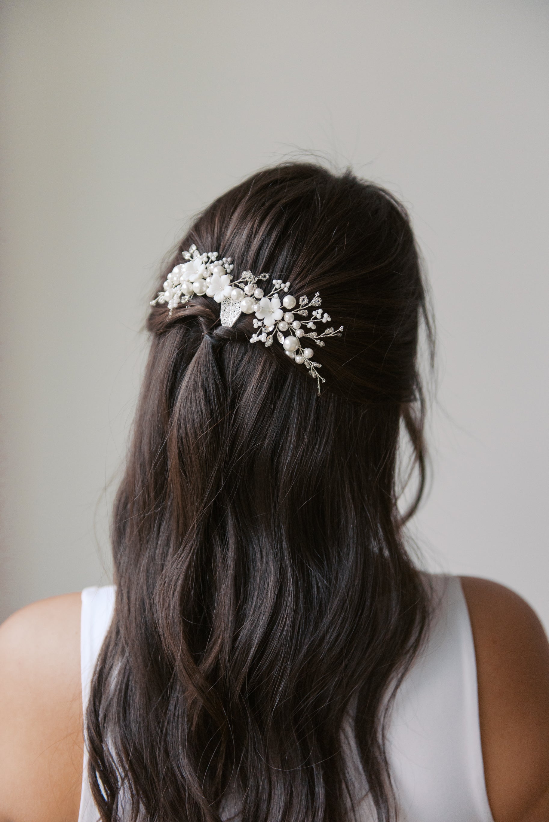 Adorned with porcelain flowers, pearls, and delicate beads, this hair comb is the perfect finishing touch to complete your bridal look.
