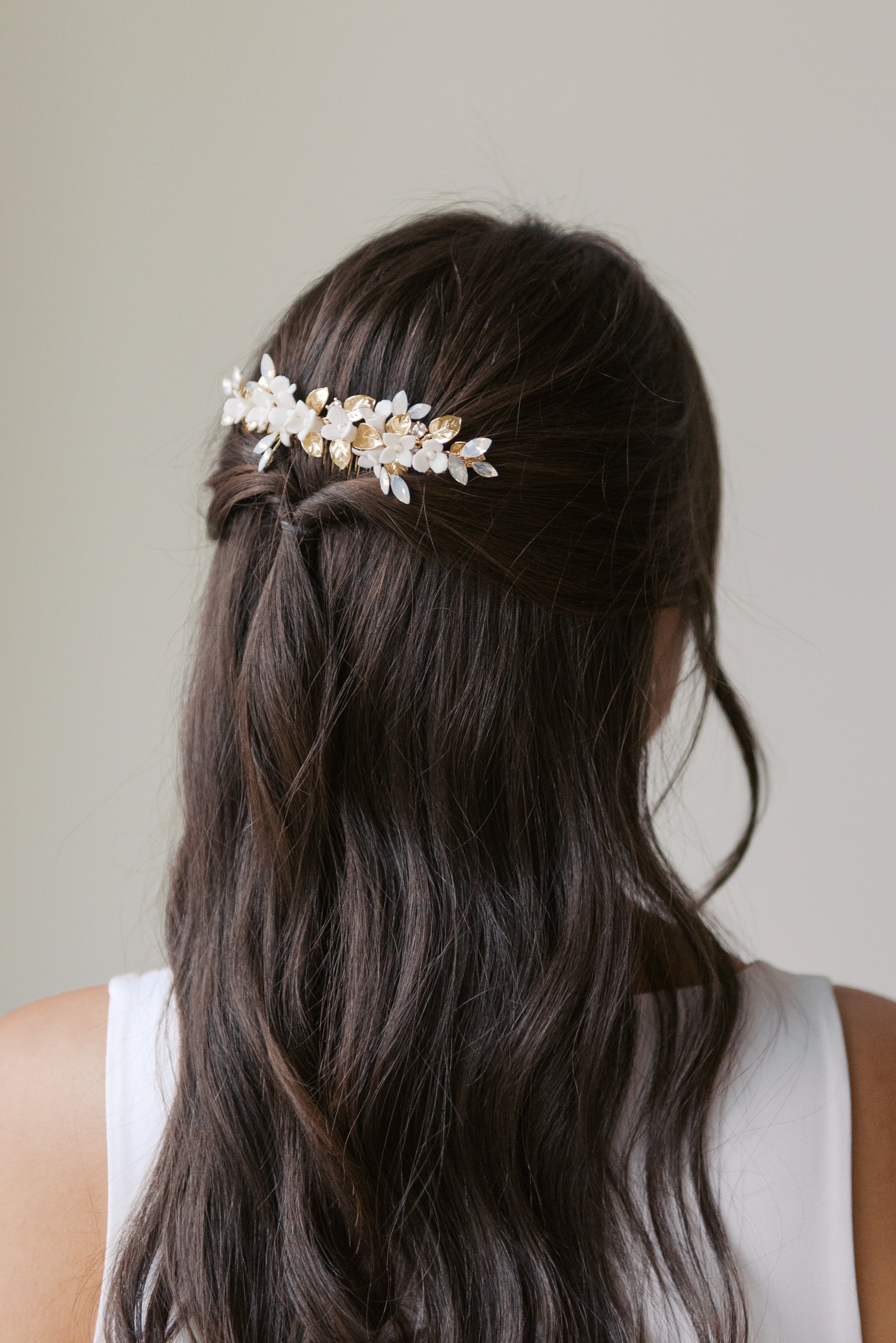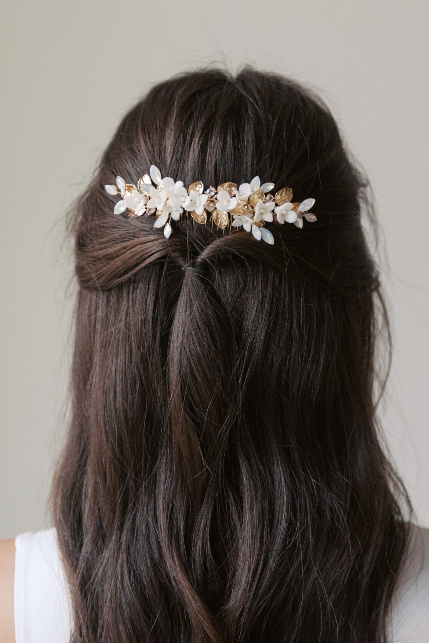 Adorned with porcelain flowers, opal rhinestones, delicate beads and gold leaves, this hair comb is the perfect finishing touch to complete your bridal look.