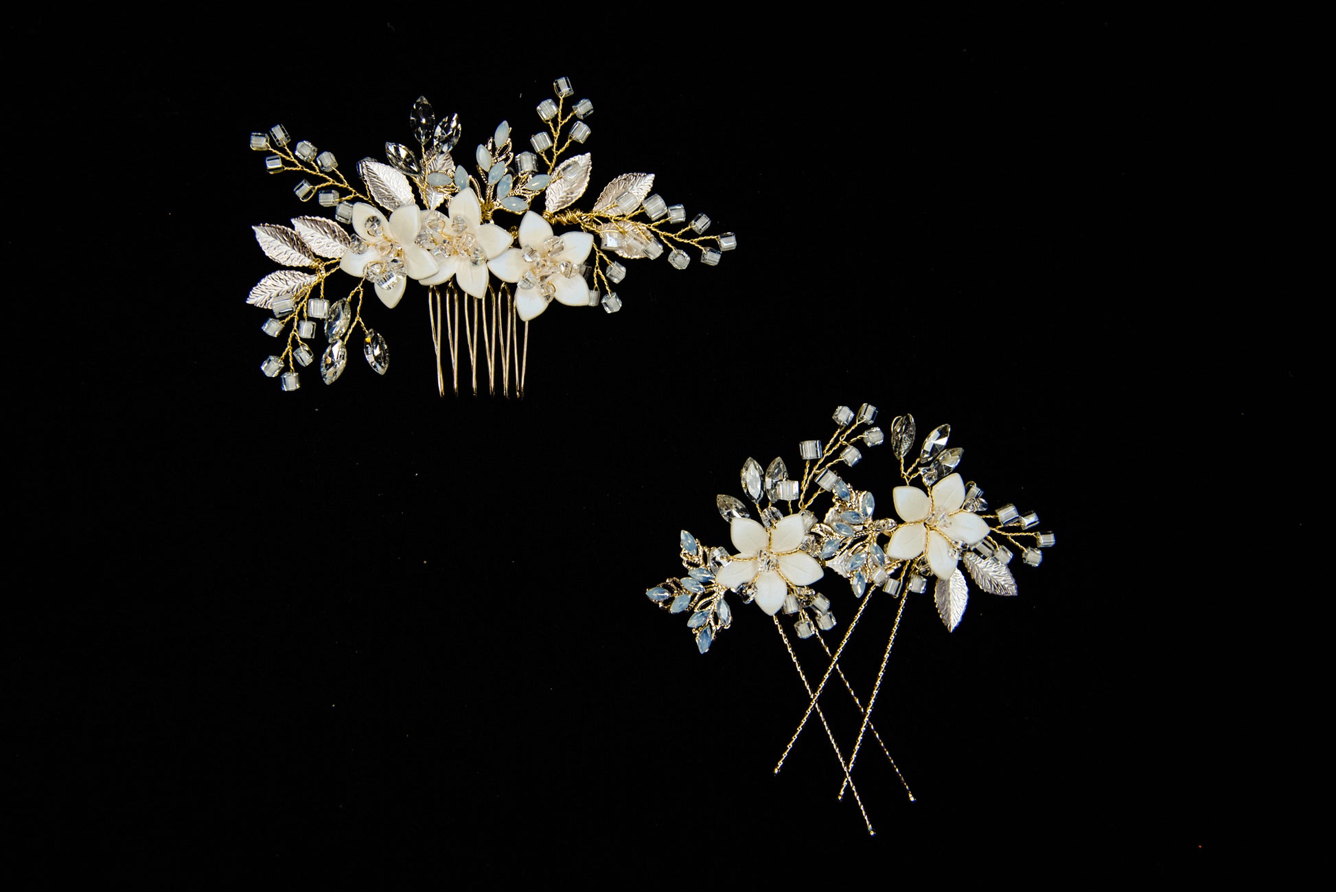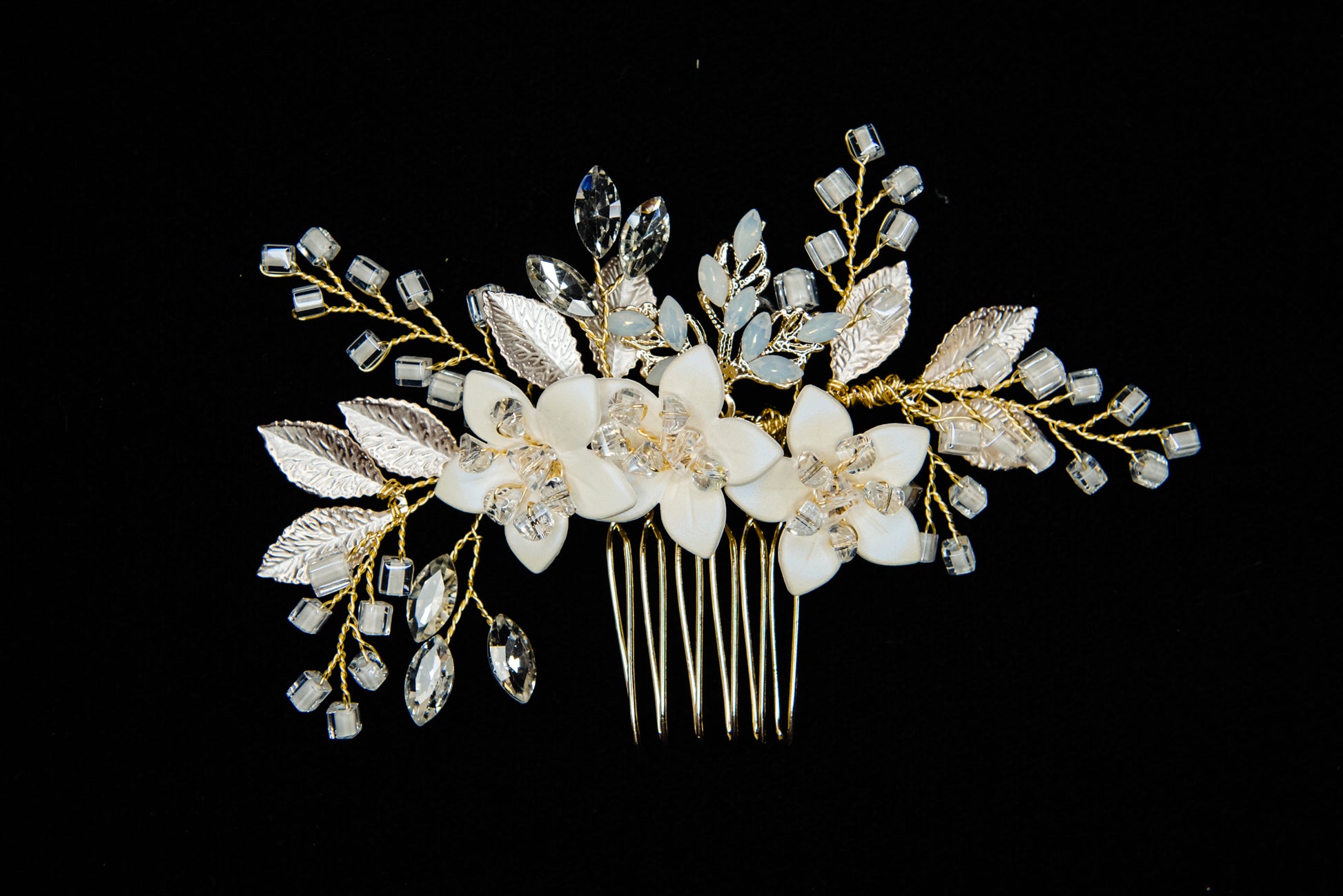 It took me awhile to decide on a comb and let me say I am so glad to have picked the Etta! It is stunning and the porcelin flowers are lovely. This piece is filled with details and is absolutely beautiful. Big shout out to the duo of Brides and Belts, easy to communicate with and are very tentive and quick to respond and help. Shipping was fast and it came perfectly packaged. I can't say this enough but thank you Brides and Belts, I absolutely love the Etta and I can't wait to wear this on my Wedding Day.