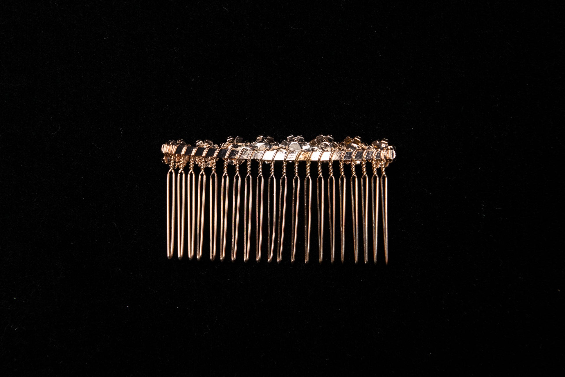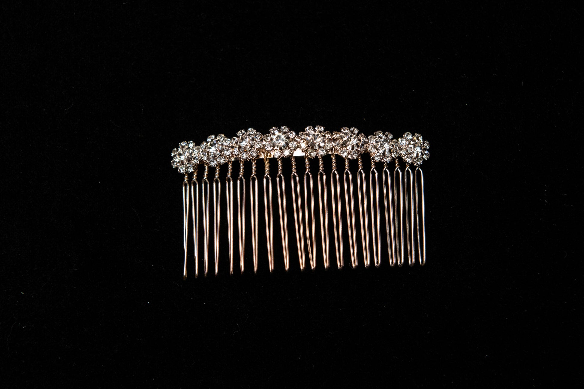 The Jennifer hair comb is high quality and crafted with genuine rhinestones. This hair comb comes in a gold colour. It's a beautiful addition of bling and glamour to your hair on your wedding day!