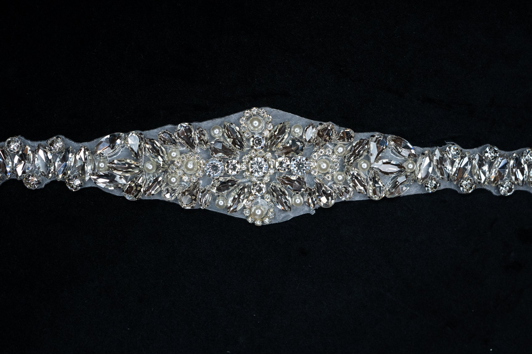 This gorgeous handmade rhinestone, crystal and pearl applique is the perfect addition to your wedding dress.