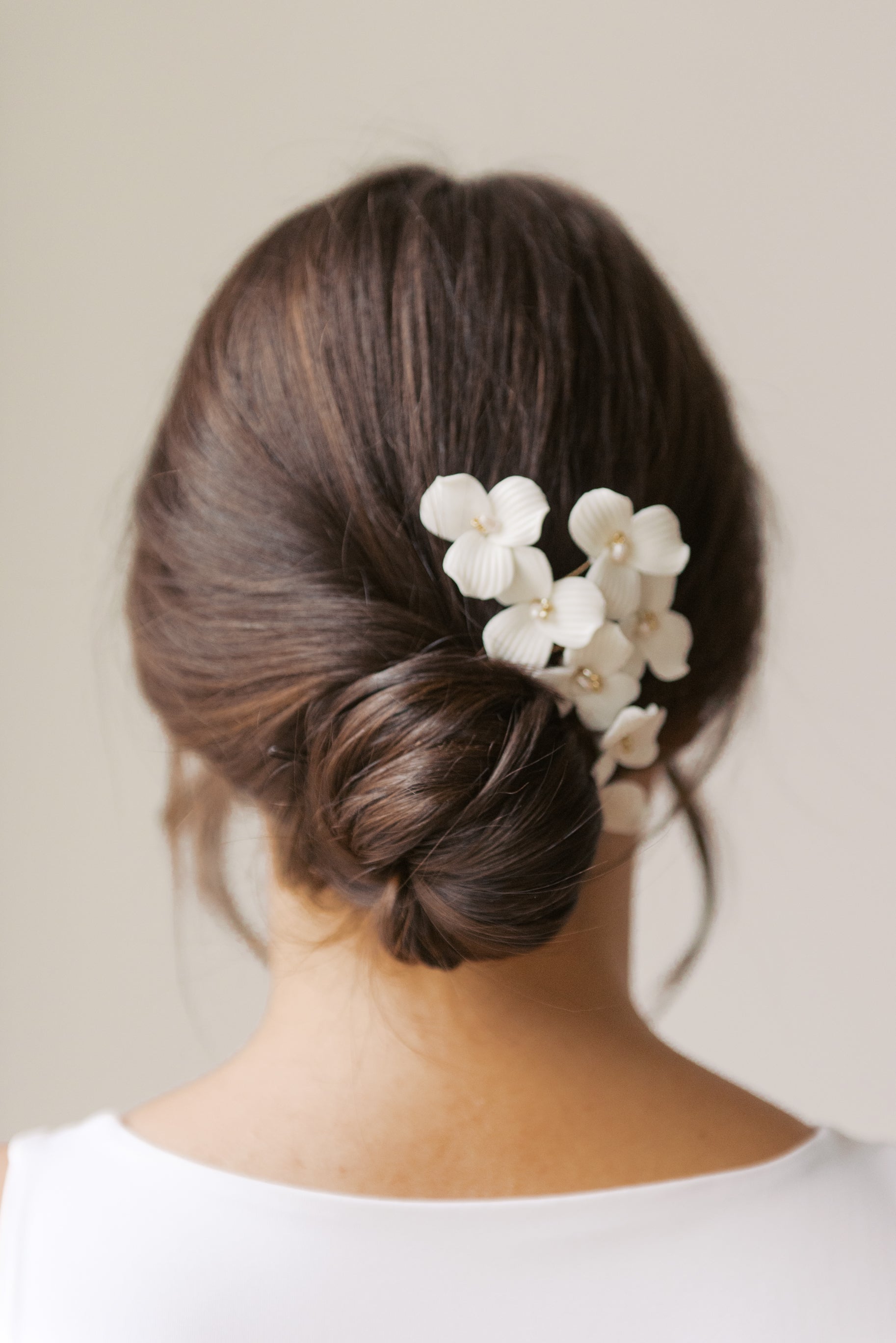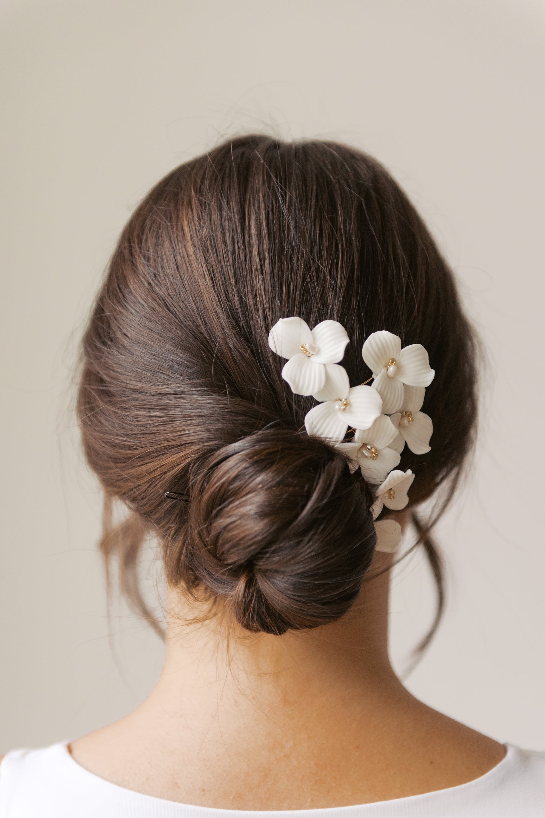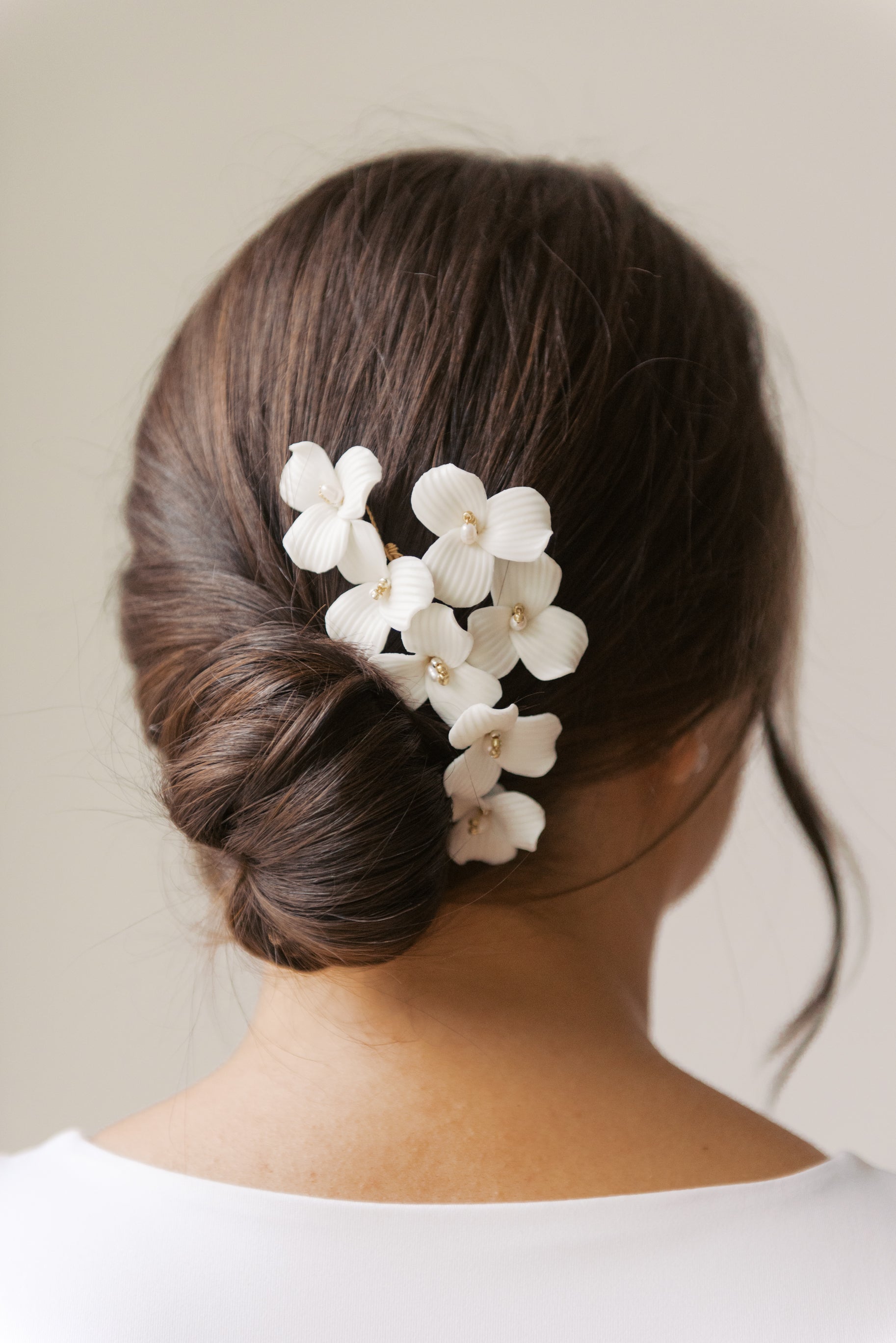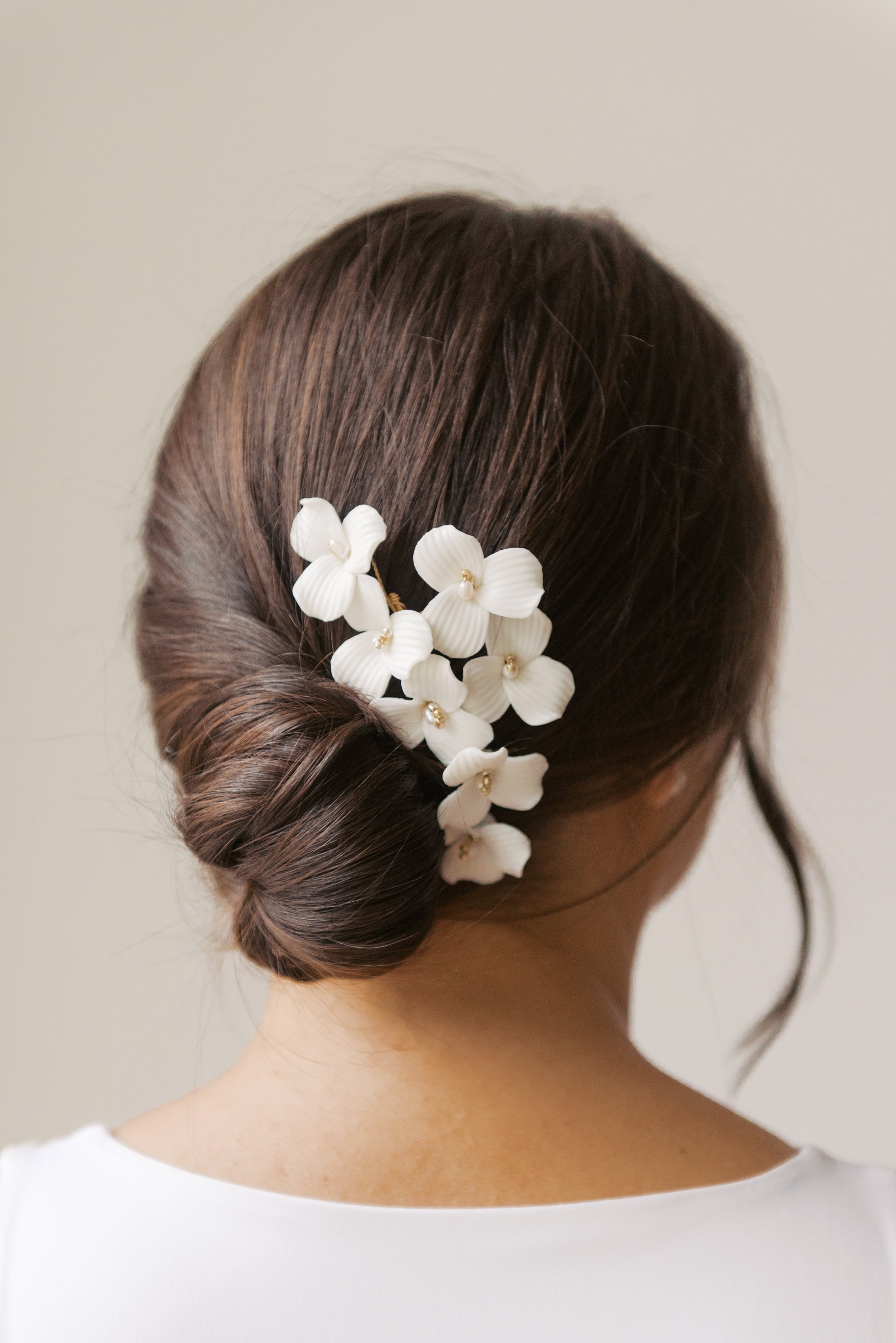 With its bold porcelain flowers, this gold hair comb has a modern feel and would be the perfect finishing touch to complete your bridal look.