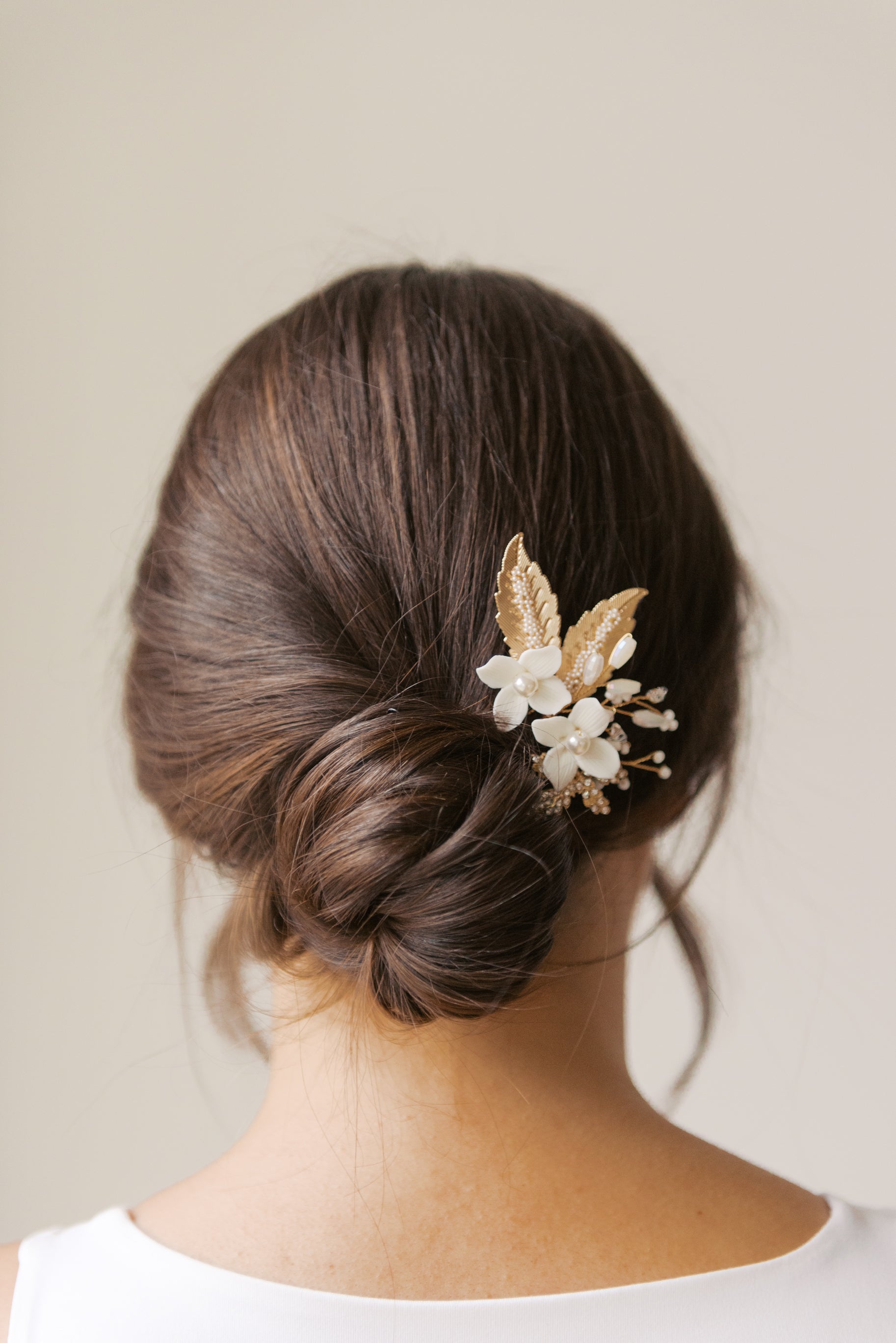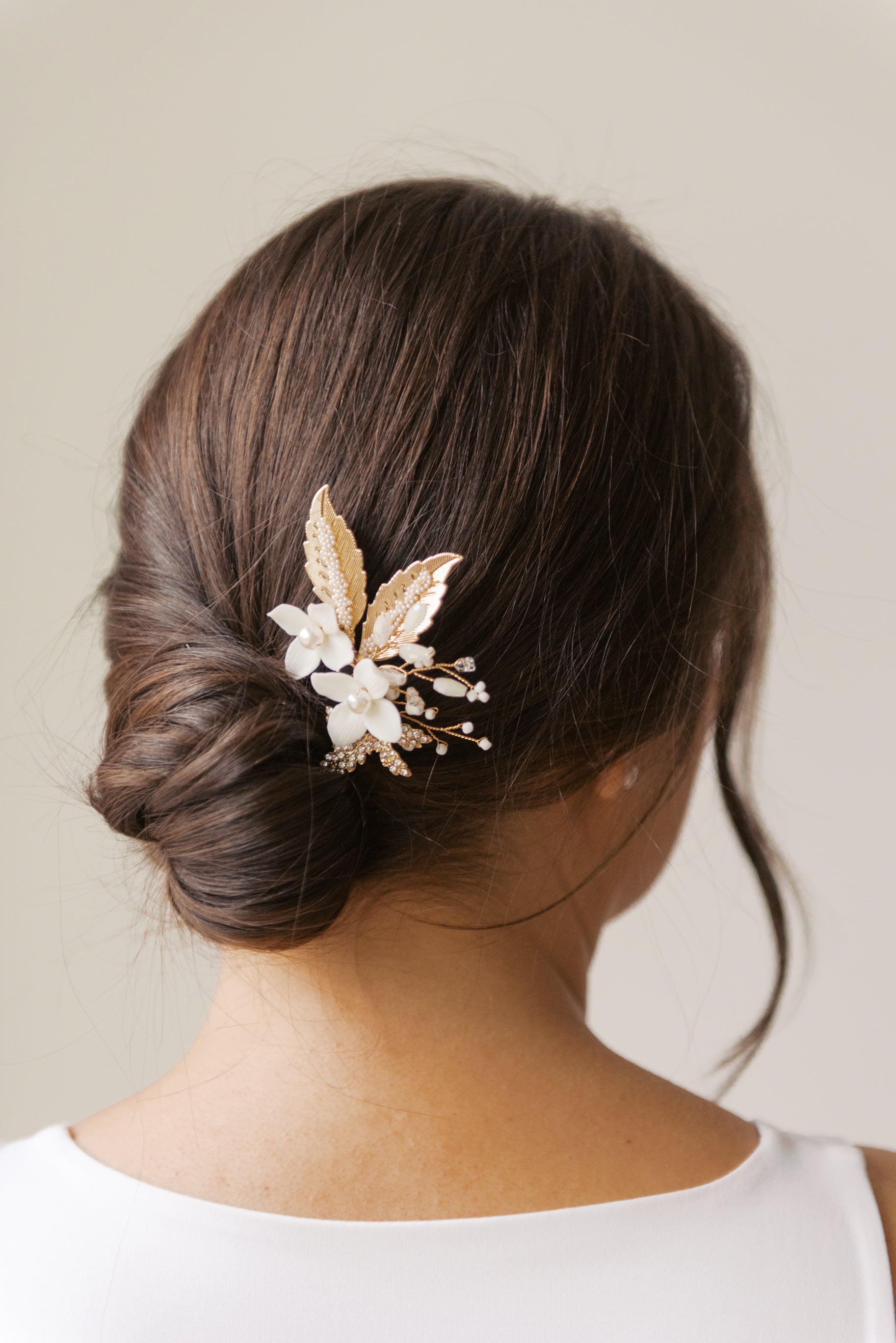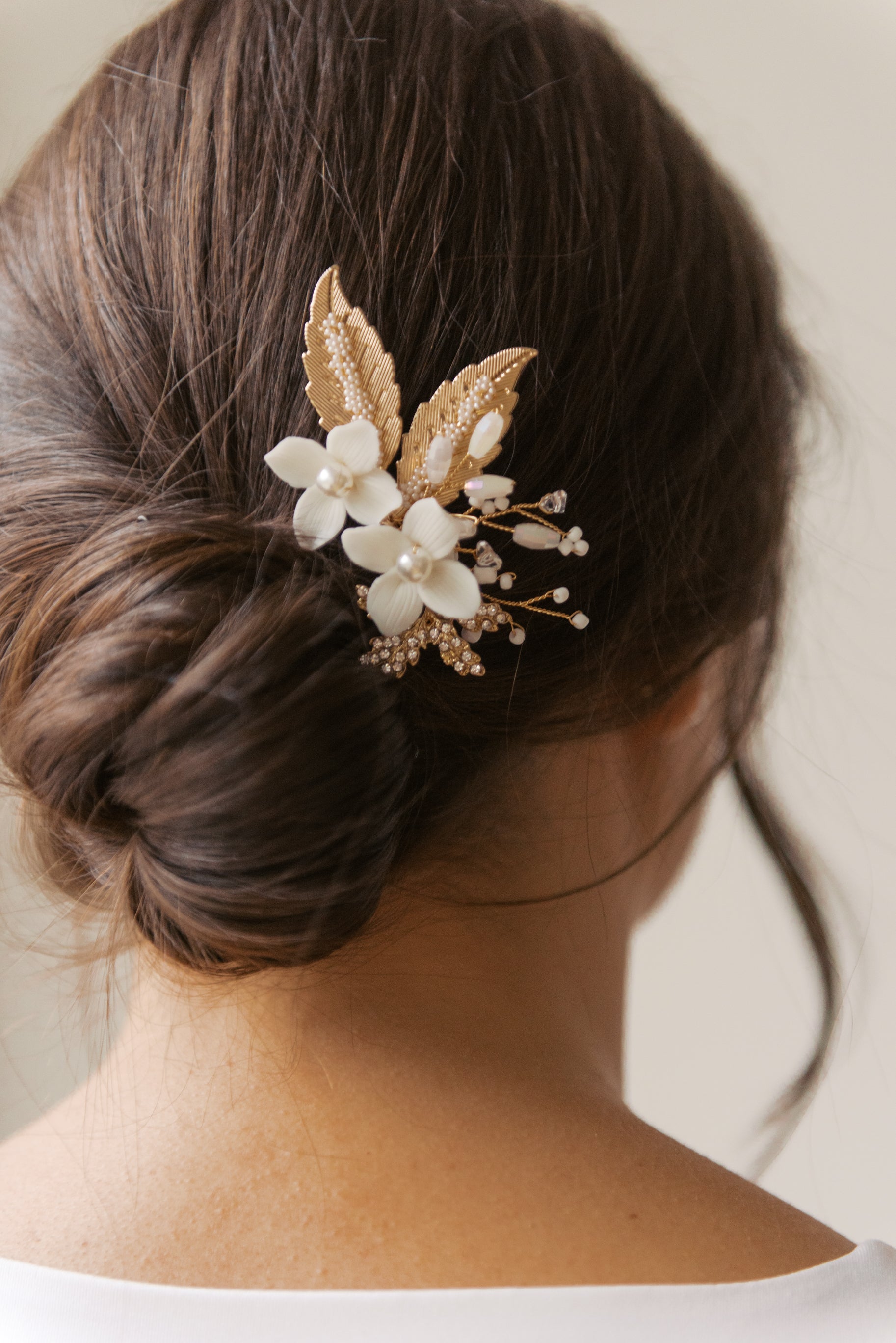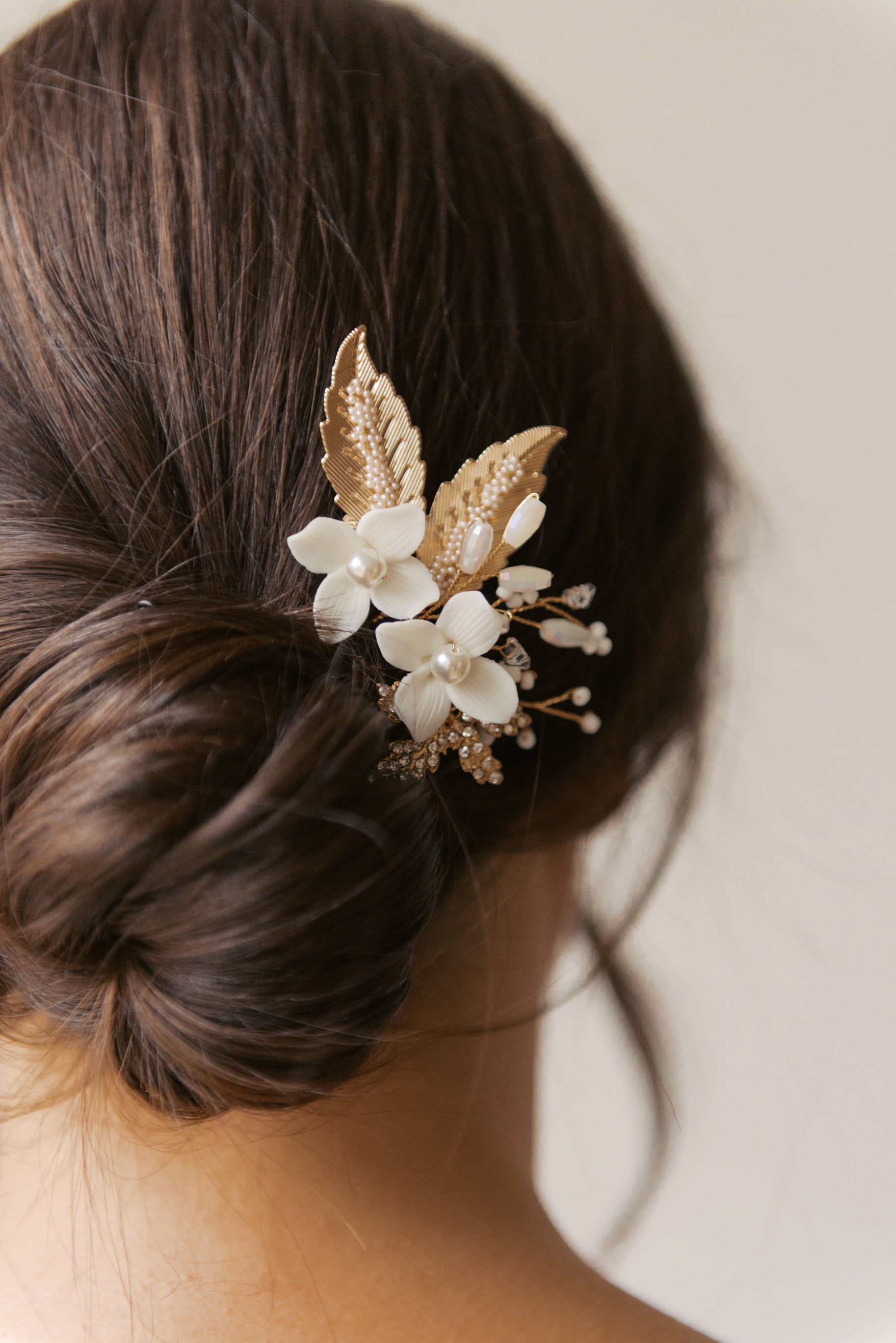 Adorned with bold porcelain flowers, delicate beads and gold leaves, this hair comb has an organic, romantic feel and would make the perfect finishing touch to complete your bridal look.