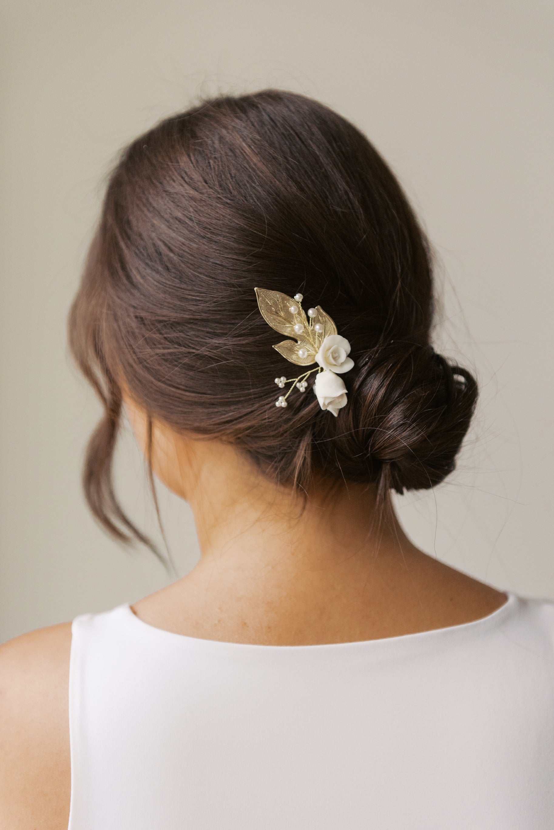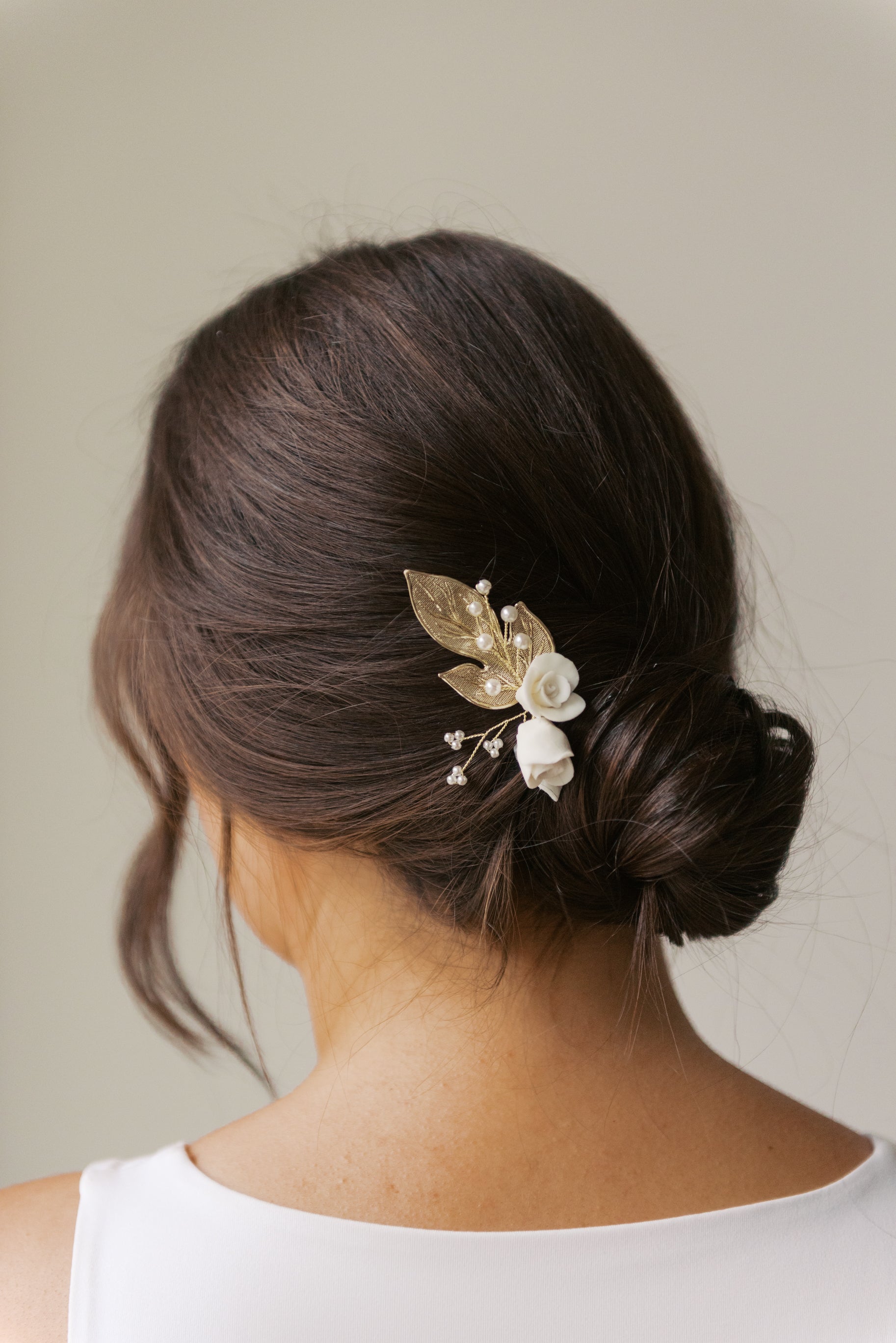 Adorned with bold porcelain flowers, delicate beads and gold leaves, this hair comb has an organic, romantic feel and would make the perfect finishing touch to complete your bridal look.