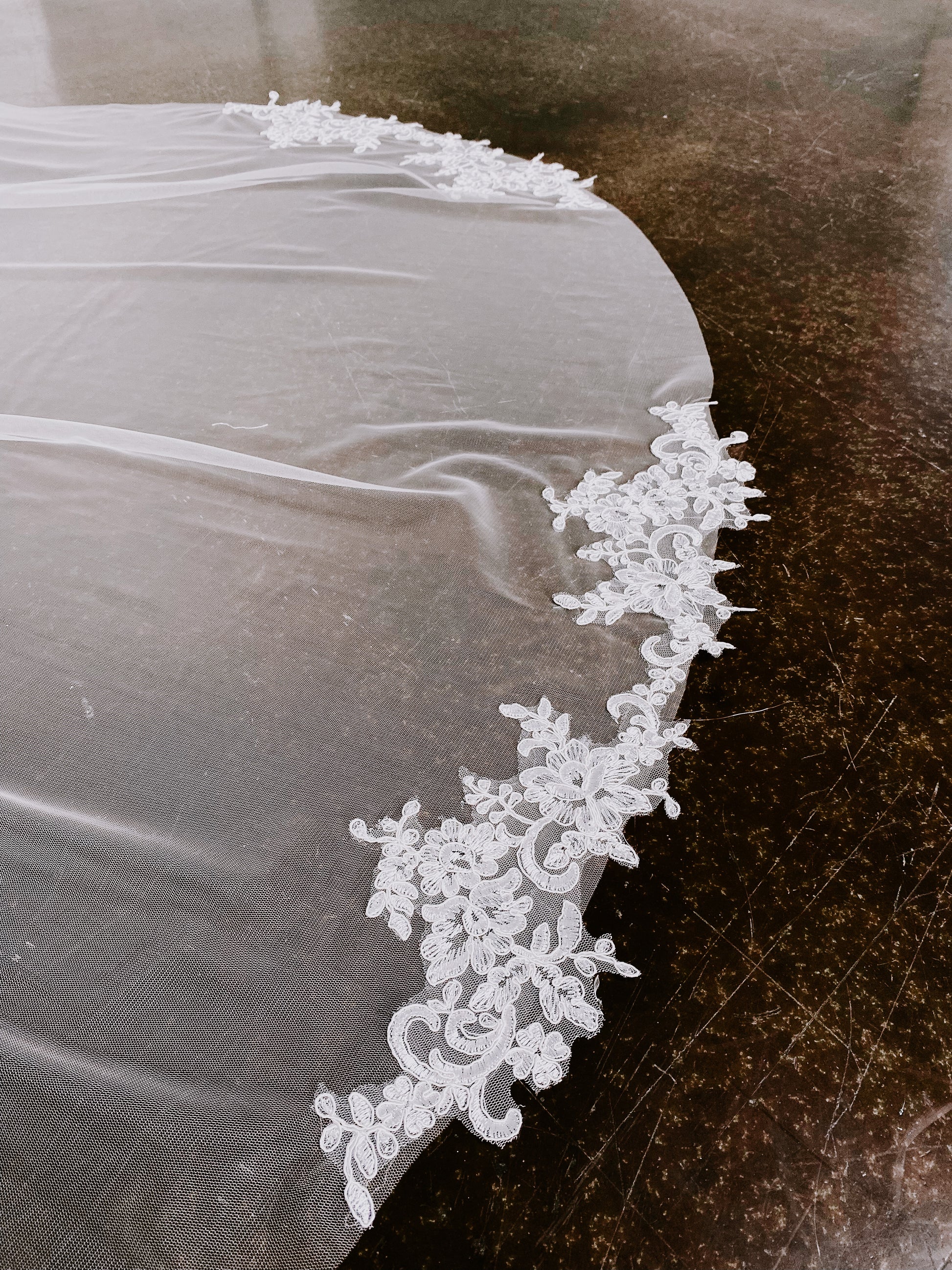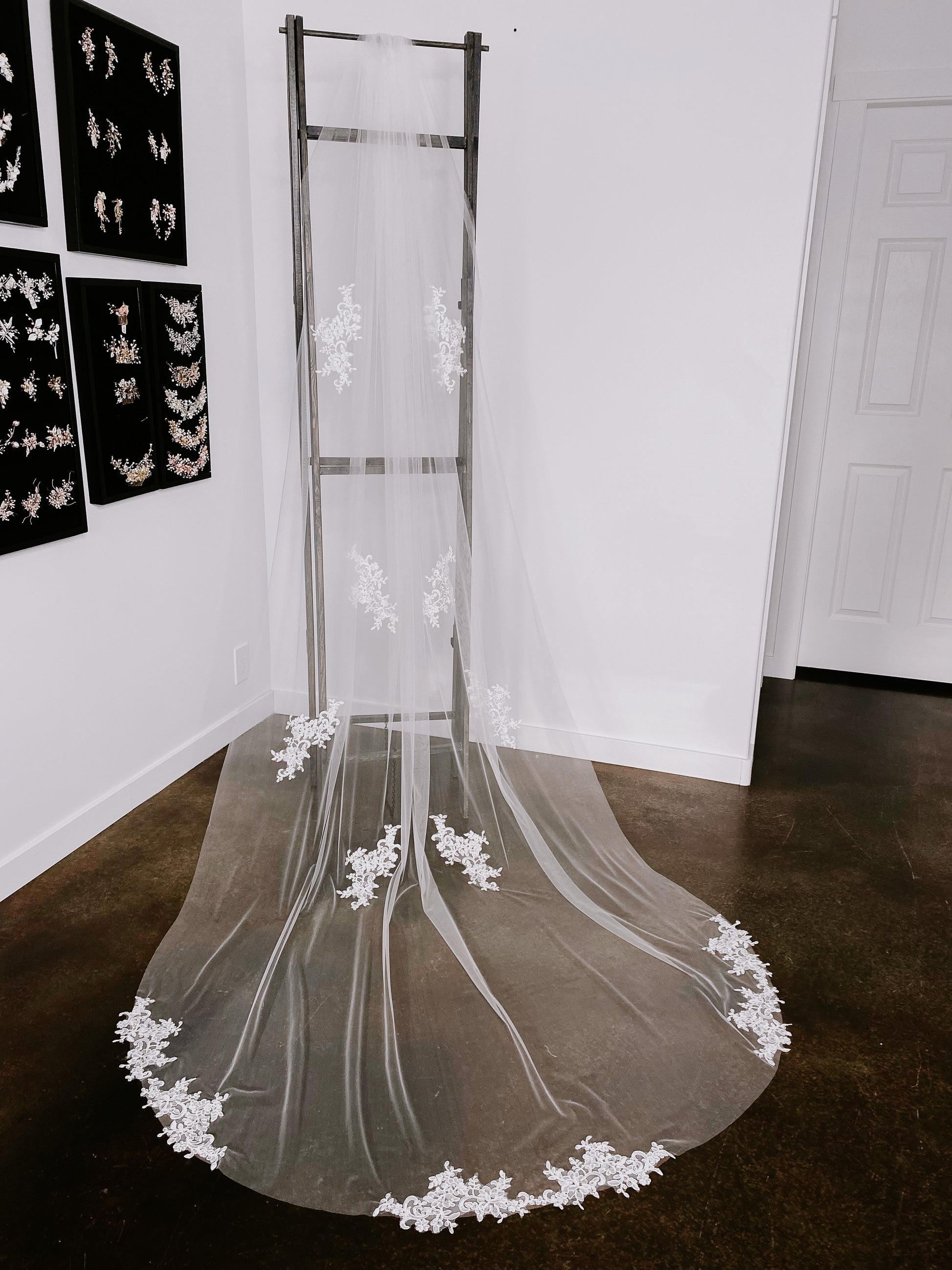 This high quality veil is handcrafted and has beautiful lace scattered throughout the veil. It's a beautiful addition on your wedding day!